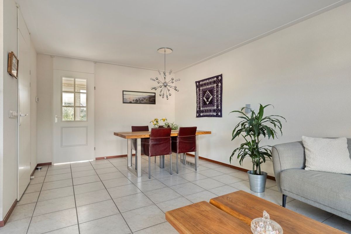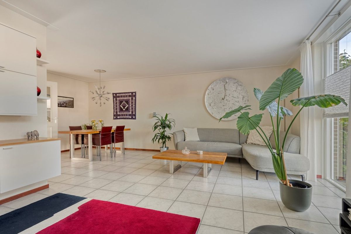 Aan de voorzijde van de woning bevindt zich een ruime en lichte woonkamer, voorzien van een plavuizen vloer met vloerverwarming en radiatoren, gestuukte wanden en een glad gepleisterd plafond met platte plintafwerking. De houten kozijnen zijn voorzien van HR++ glas, wat bijdraagt aan het uitstekende energielabel (A).