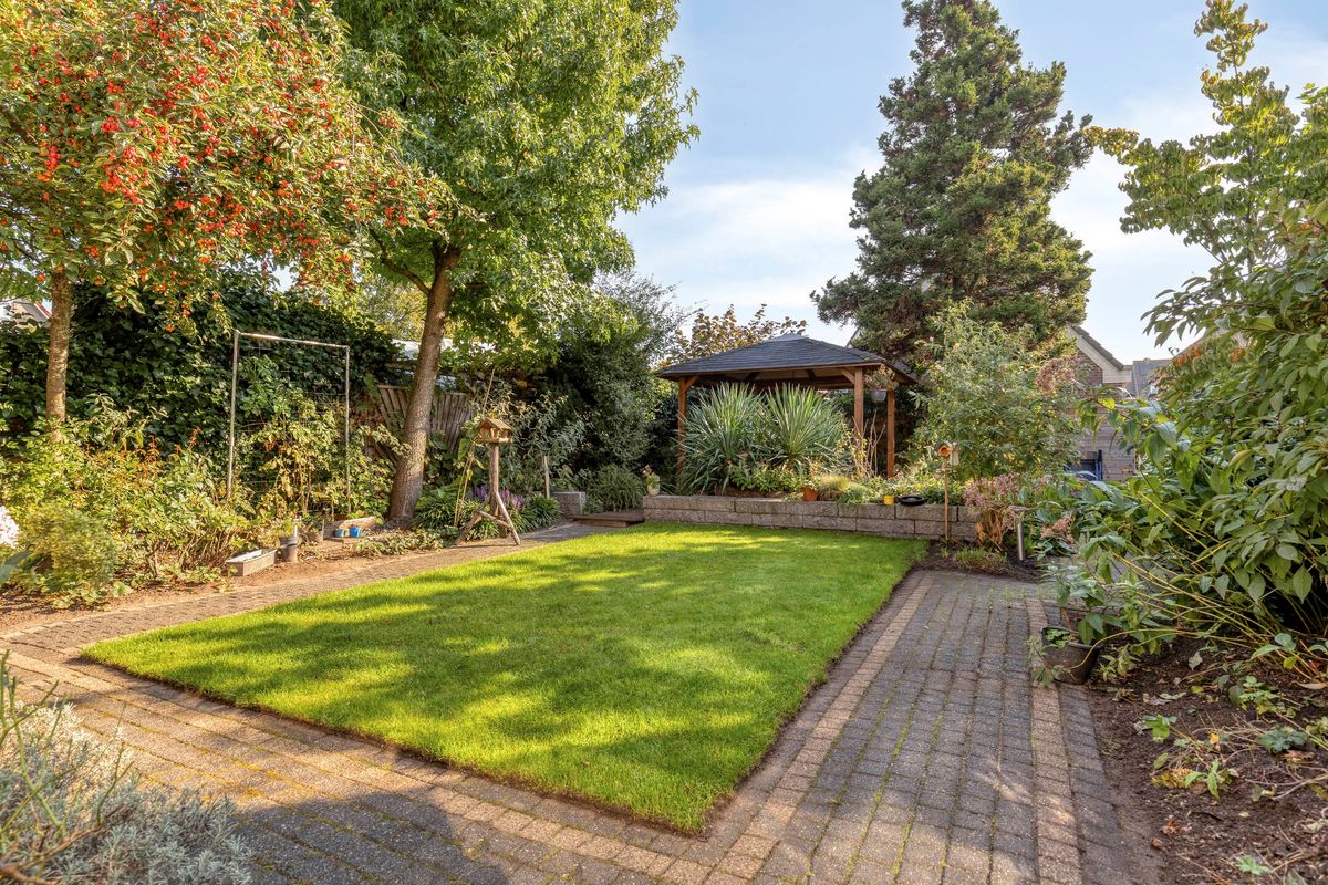 De achtertuin is ronduit spectaculair te noemen. Zo’n 270 m² eigen groene oase op het zonnige zuidoosten, royaal omsloten door volwassen bomen en struiken. Wil je de dag beginnen met een ontbijtje buiten, een zomerse barbecue tot in de avondzon, of juist wat verkoeling opzoeken? Het kan allemaal dankzij de combinatie van overdekt terras en het gezellige prieel, helemaal achterin de tuin.