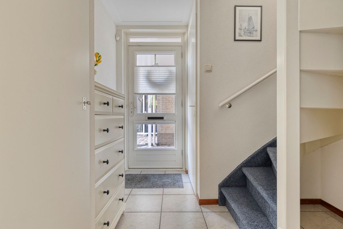 Entree via de zijkant van de woning in een hal met toegang tot het toilet, de meterkast en de trapopgang naar de eerste verdieping.