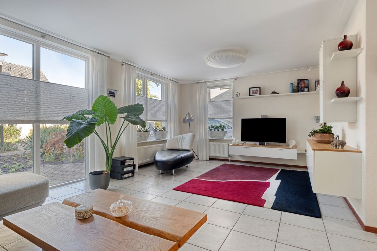 Aan de voorzijde van de woning bevindt zich een ruime en lichte woonkamer, voorzien van een plavuizen vloer met vloerverwarming en radiatoren, gestuukte wanden en een glad gepleisterd plafond met platte plintafwerking. De houten kozijnen zijn voorzien van HR++ glas, wat bijdraagt aan het uitstekende energielabel (A).