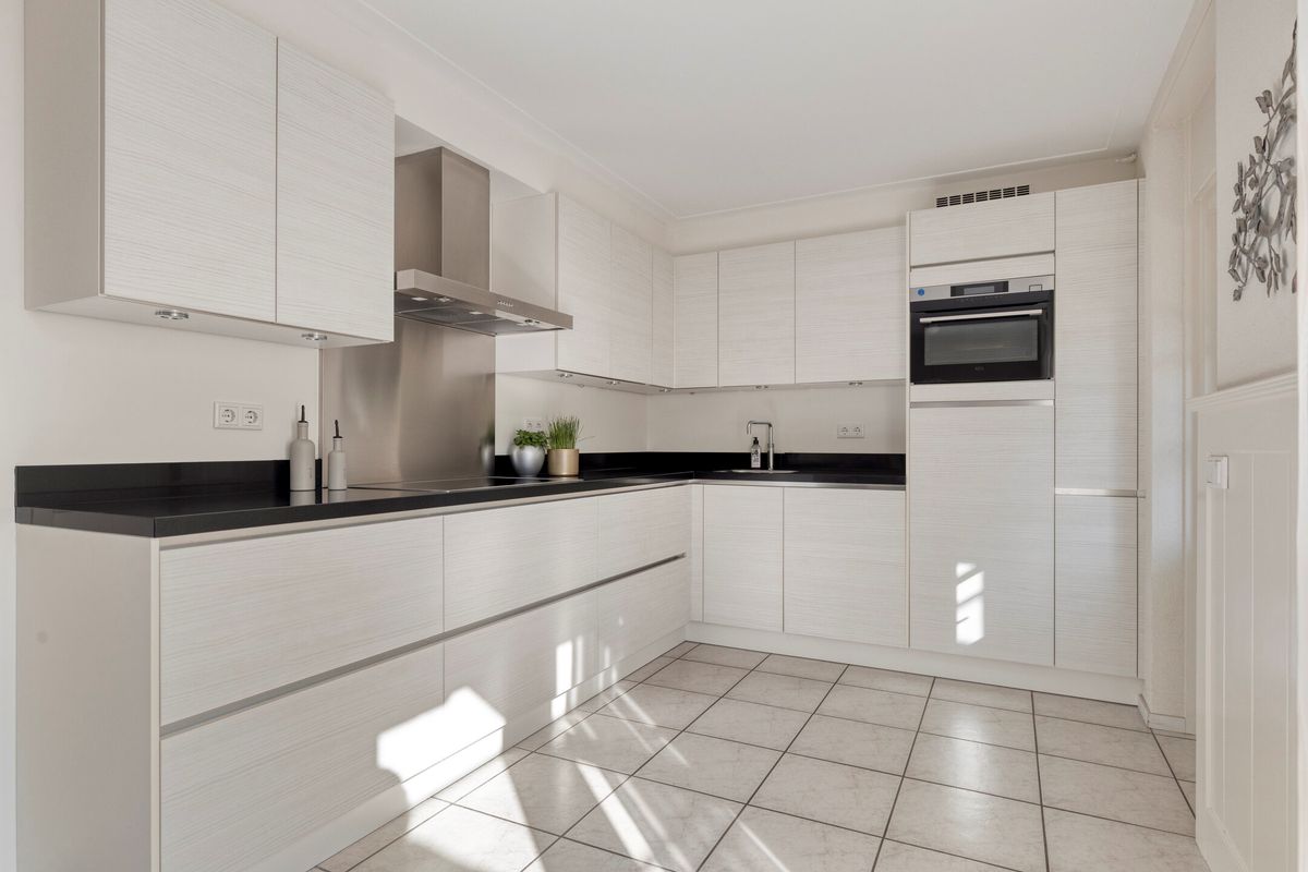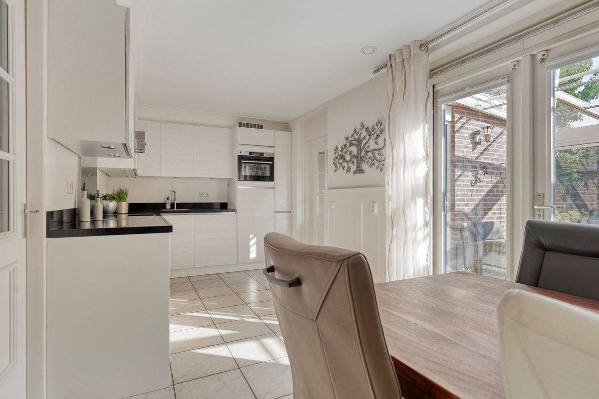 Aan de achterzijde van de woning bevindt zich een gesloten keukenruimte, uitgerust met een moderne keuken (hoekopstelling, 2014) voorzien van diverse inbouwapparatuur, waaronder: