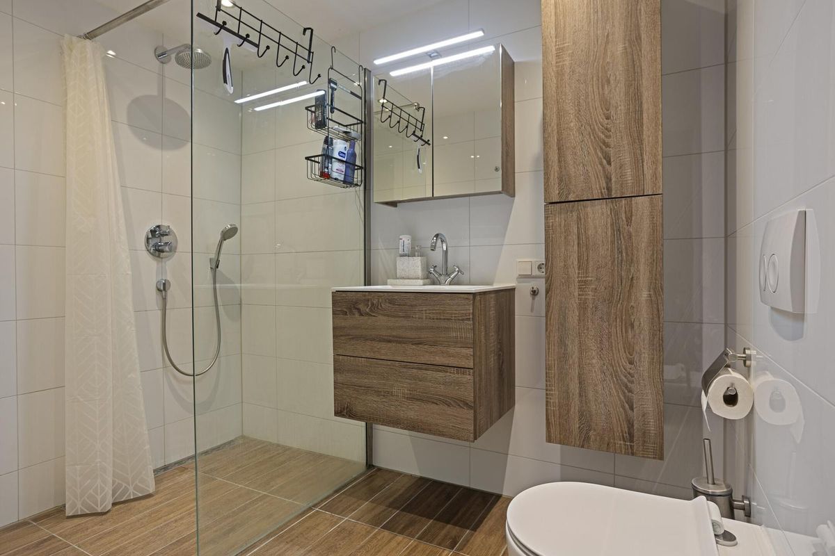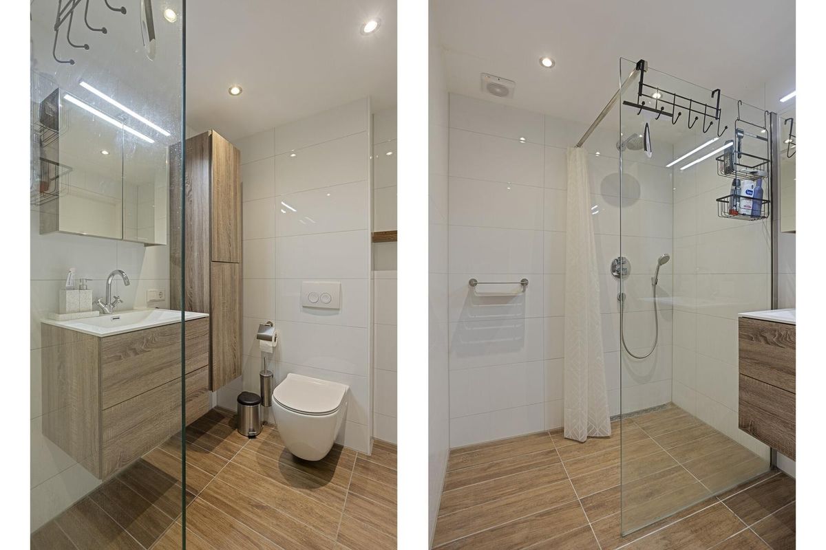 De badkamer is modern en praktisch ingericht, met een douche, wastafelmeubel en toilet. De afwerking is verzorgd en neutraal, zodat je er zo in kunt trekken.