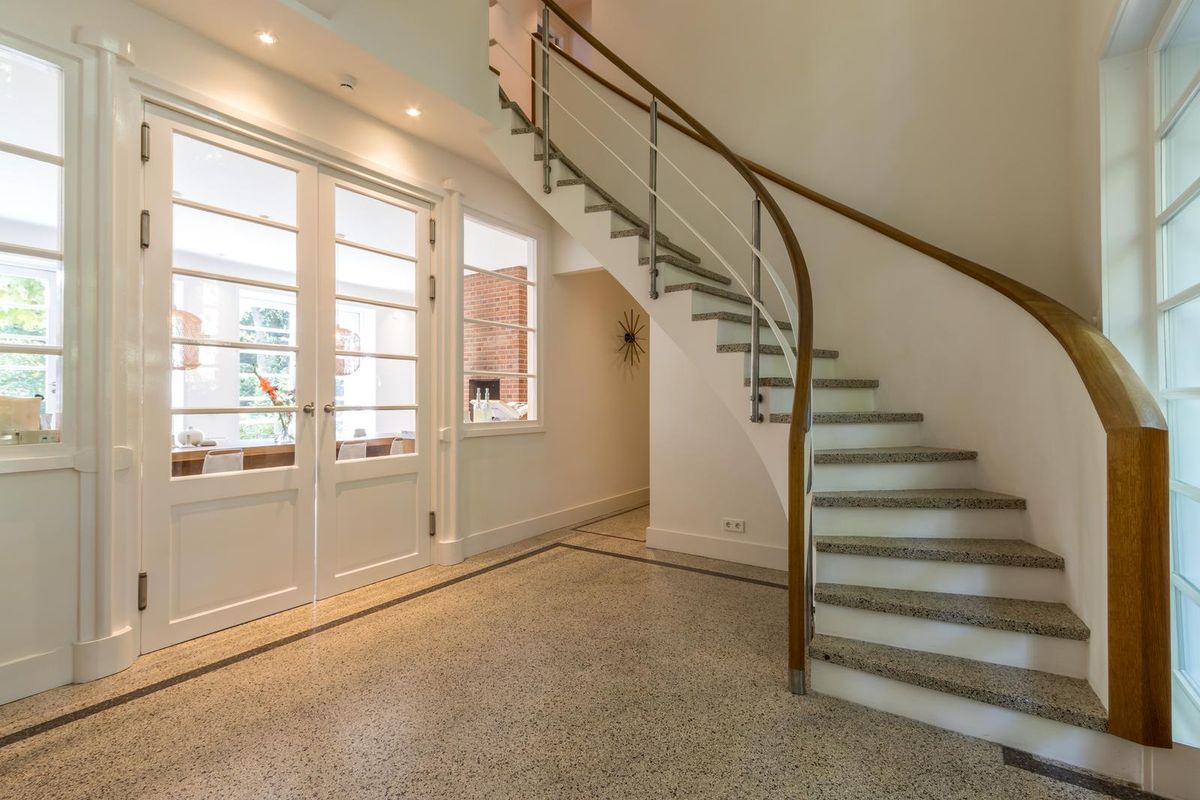 U betreedt deze prachtige, in jaren 30 stijl gebouwde villa, via een imposante entree. In de majestueuze hal maakt de stijlvolle trap direct indruk. Een waar meesterstuk dat het huis helemaal af maakt. De granito vloeren op de begane grond en traptreden zijn speciaal voor het huis ontworpen en ter plaatse gestort en afgewerkt. In de entreehal bevindt zich ook een apart toilet en een ruime garderobe.