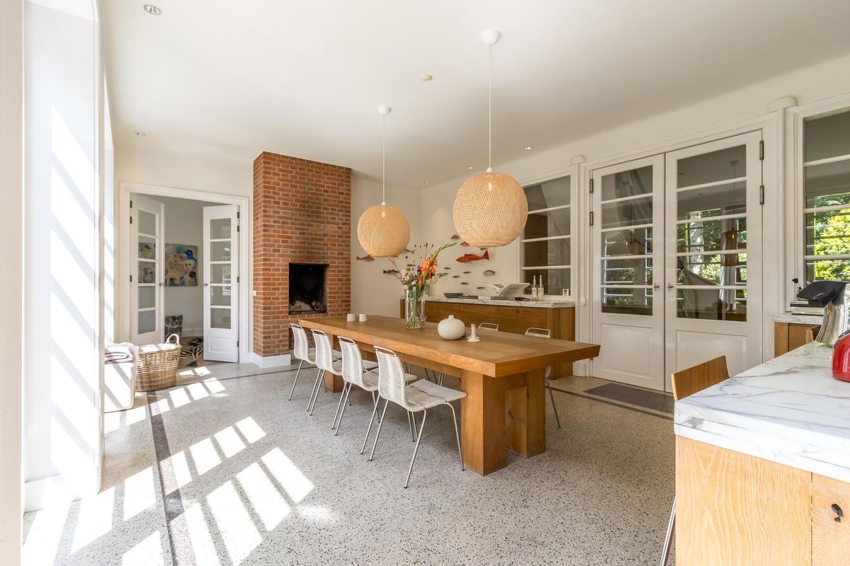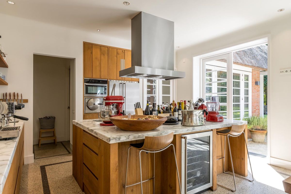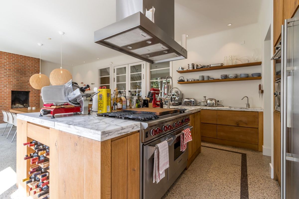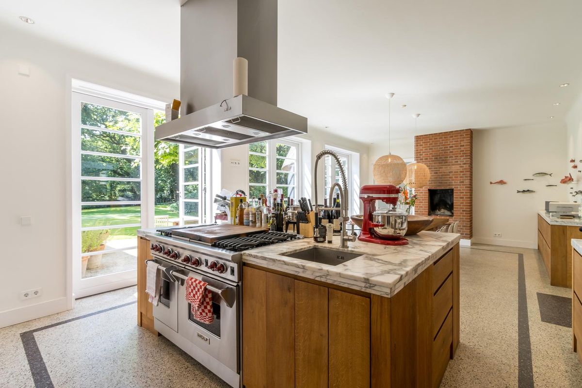 Via de dubbele glazen deuren bereikt u de stijlvolle royale open keuken met kookeiland, voorzien van professionele horeca apparatuur van Wolf en Miele, zeer geschikt voor het organiseren van grote diners. De leefkeuken is in het midden van het huis gesitueerd en vormt de centrale leefplek. Met ruimte aan een grote eettafel en een “echte” openhaard, waar u heerlijk met familie of vrienden kunt dineren en op een zomerse dag een of meerdere van de drie dubbele deuren naar de prachtige tuin kunt openen.