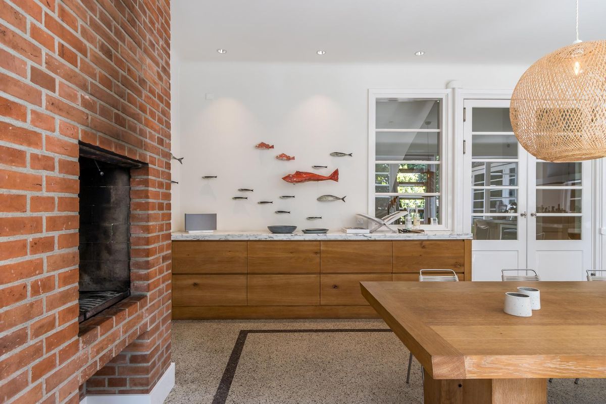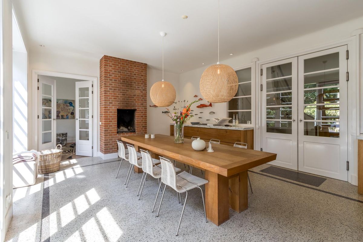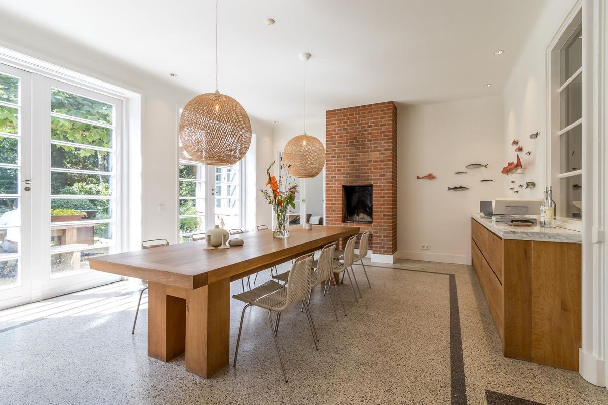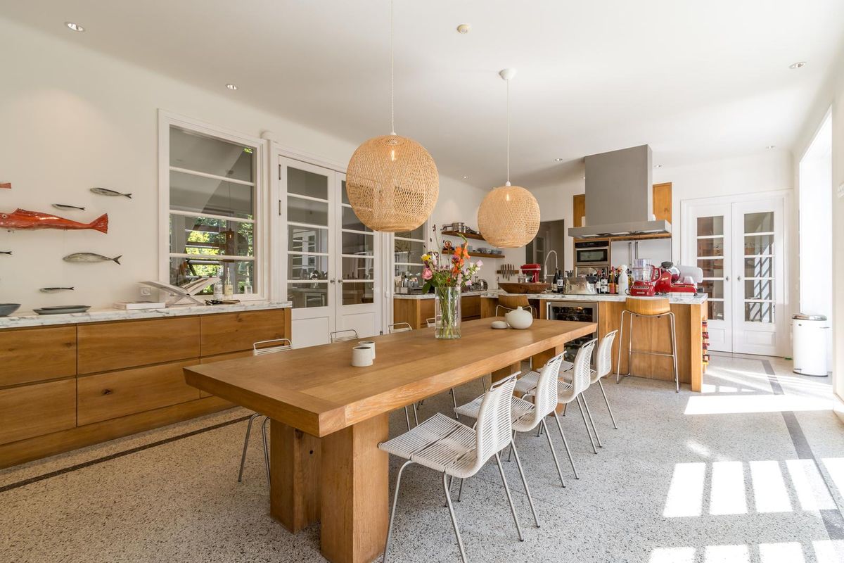 Via de dubbele glazen deuren bereikt u de stijlvolle royale open keuken met kookeiland, voorzien van professionele horeca apparatuur van Wolf en Miele, zeer geschikt voor het organiseren van grote diners. De leefkeuken is in het midden van het huis gesitueerd en vormt de centrale leefplek. Met ruimte aan een grote eettafel en een “echte” openhaard, waar u heerlijk met familie of vrienden kunt dineren en op een zomerse dag een of meerdere van de drie dubbele deuren naar de prachtige tuin kunt openen.