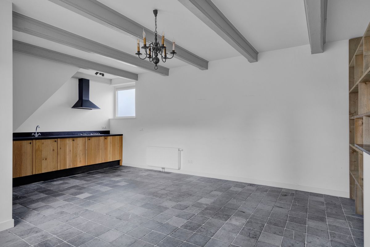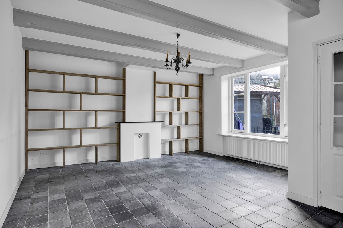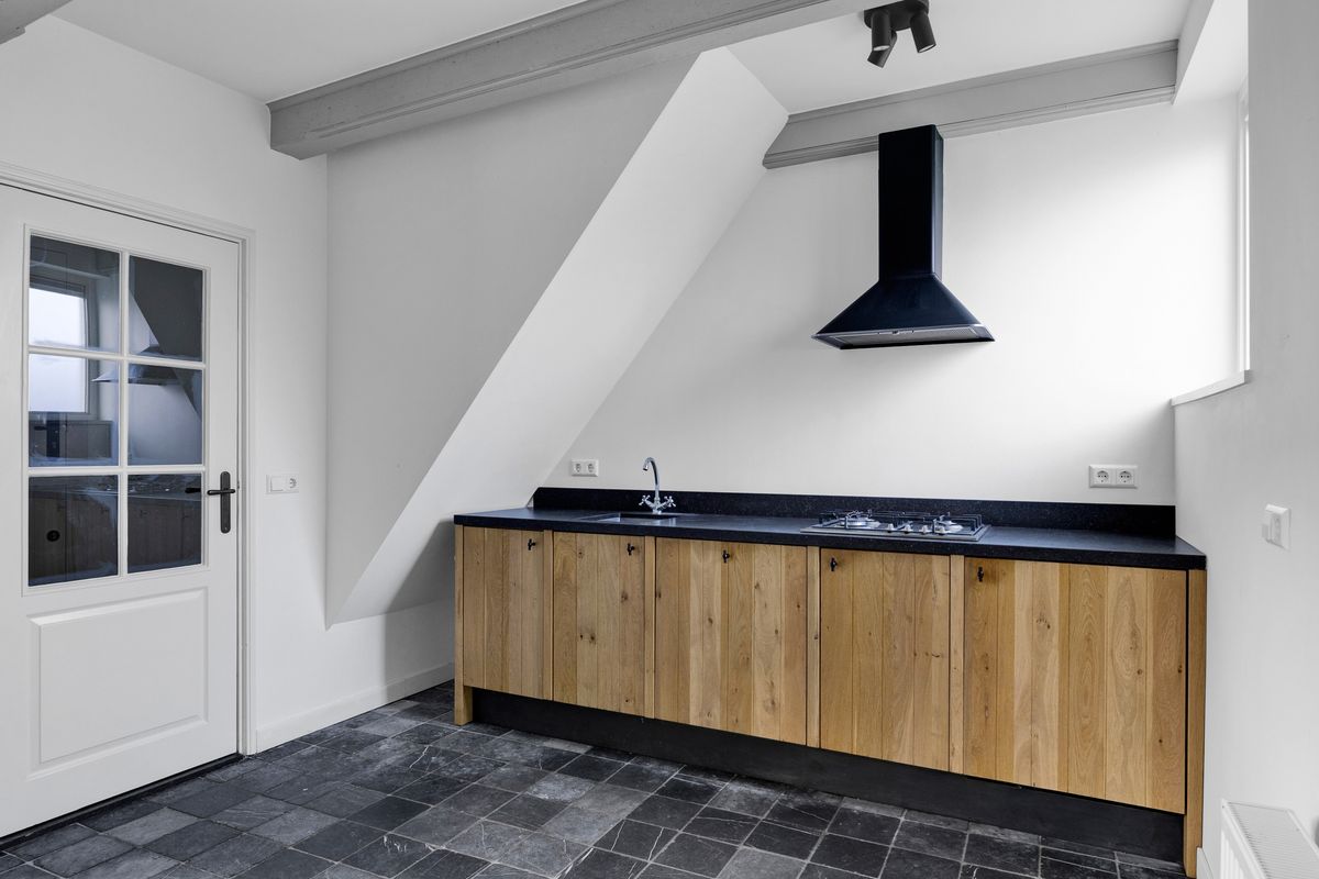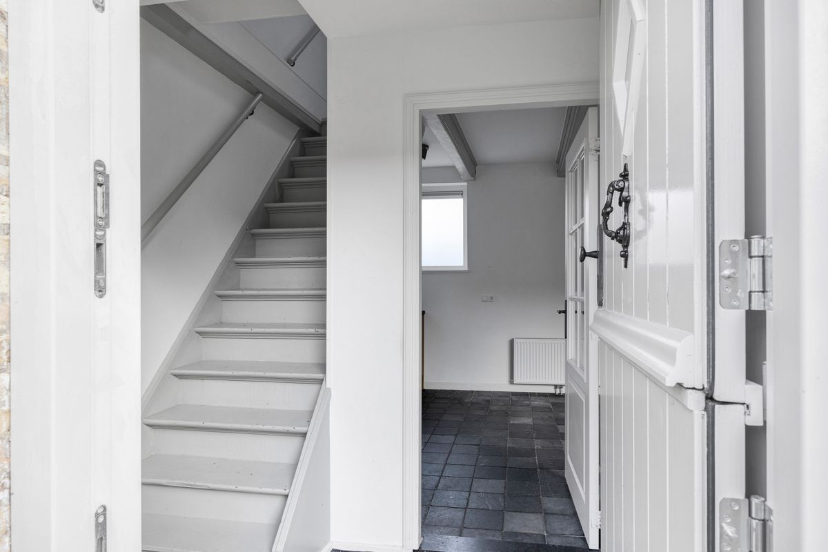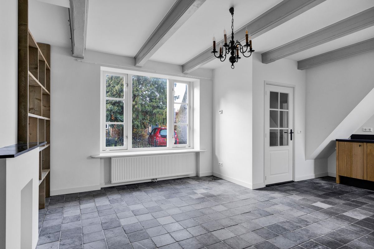 We betreden de woning via de voordeur en komen in de hal met meterkast, trapopgang en toegang tot de sfeervolle en knusse woonkamer met balkenplafond, schouw met boekenkast en open keuken met rechte keukenopstelling geheel in stijl, welke voorzien is van diverse inbouwapparatuur zoals; koelkast, gaskookplaat, afzuigkap en vaatwasser.