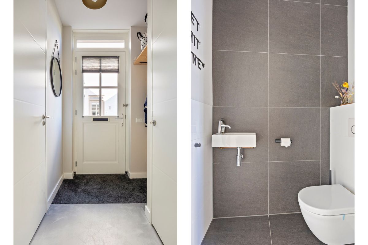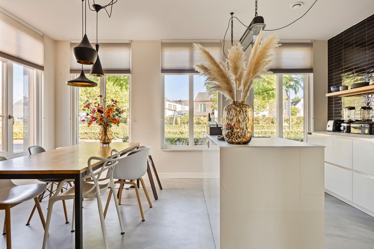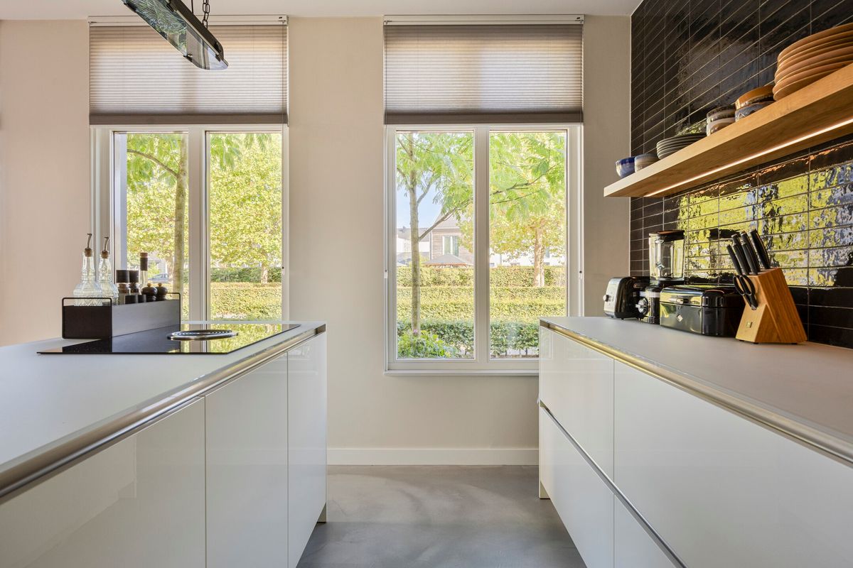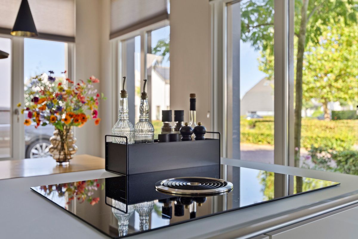 Vanuit de hal/entree met meterkast is er toegang tot het toilet en het middengedeelte van de woning. De keuken is aan de voorzijde van de woning gelegen. De woonkamer is aan de achterzijde gelegen en heeft een prettig zicht op de hoogwaardig aangelegde achtertuin welke bereikbaar is middels een schuifpui. Vanuit de woonkamer is een speel-/werkkamer bereikbaar. Vanuit deze kamer zijn de achtertuin en de garage bereikbaar. De rechte keuken (van Diessen) met kookeiland en wandopstelling is v.v. diverse kasten en lades, een modern glazen werkblad met spoelbak en kokend waterkraan (Quooker) en een mengkraan, inductiekookplaat met afzuiging (Bora), combimagnetron (Siemens), koelkast, vriezer (Liebherr) en een vaatwasser. De vloer van de benedenverdieping is v.v. een betonnen gietvloer. De wanden en plafonds zijn afgewerkt met stucwerk. De kozijnen zijn van hout met HR++ glas. Het toilet is deels betegeld en v.v. een hangend toilet en fonteintje. Vanuit het middengedeelte van de woning is een halletje met inbouwkast bereikbaar en de trapopgang naar de eerste verdieping.