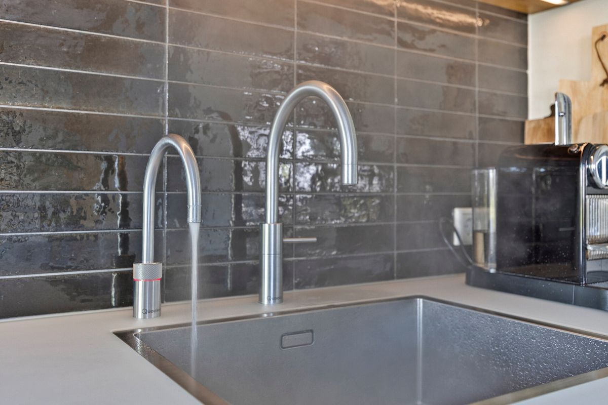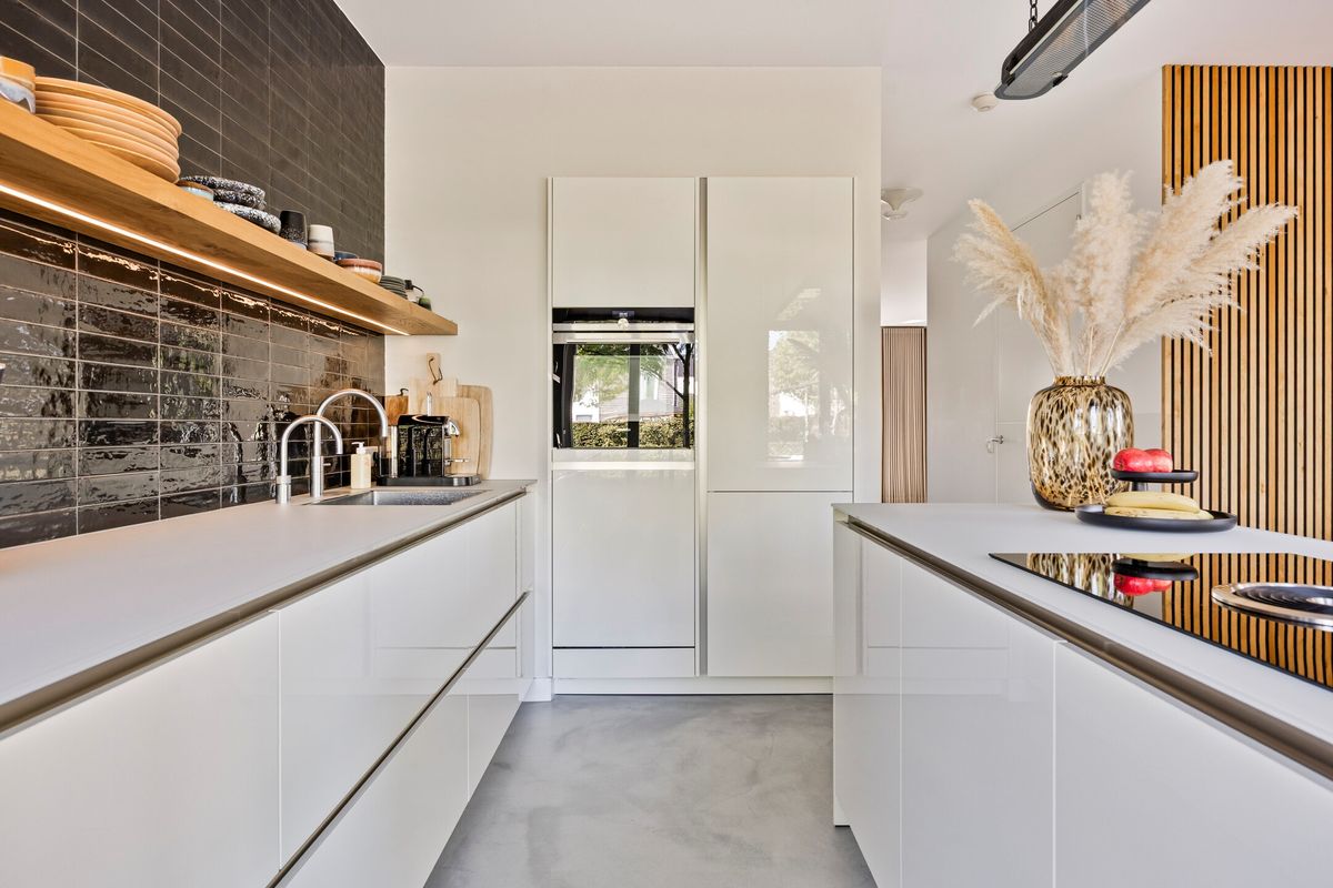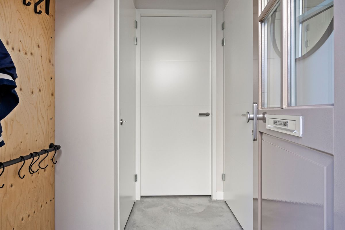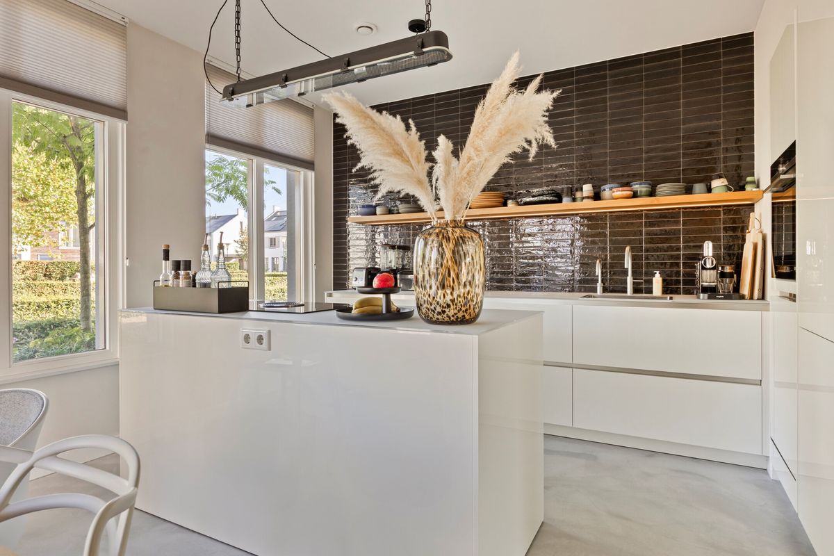 Vanuit de hal/entree met meterkast is er toegang tot het toilet en het middengedeelte van de woning. De keuken is aan de voorzijde van de woning gelegen. De woonkamer is aan de achterzijde gelegen en heeft een prettig zicht op de hoogwaardig aangelegde achtertuin welke bereikbaar is middels een schuifpui. Vanuit de woonkamer is een speel-/werkkamer bereikbaar. Vanuit deze kamer zijn de achtertuin en de garage bereikbaar. De rechte keuken (van Diessen) met kookeiland en wandopstelling is v.v. diverse kasten en lades, een modern glazen werkblad met spoelbak en kokend waterkraan (Quooker) en een mengkraan, inductiekookplaat met afzuiging (Bora), combimagnetron (Siemens), koelkast, vriezer (Liebherr) en een vaatwasser. De vloer van de benedenverdieping is v.v. een betonnen gietvloer. De wanden en plafonds zijn afgewerkt met stucwerk. De kozijnen zijn van hout met HR++ glas. Het toilet is deels betegeld en v.v. een hangend toilet en fonteintje. Vanuit het middengedeelte van de woning is een halletje met inbouwkast bereikbaar en de trapopgang naar de eerste verdieping.