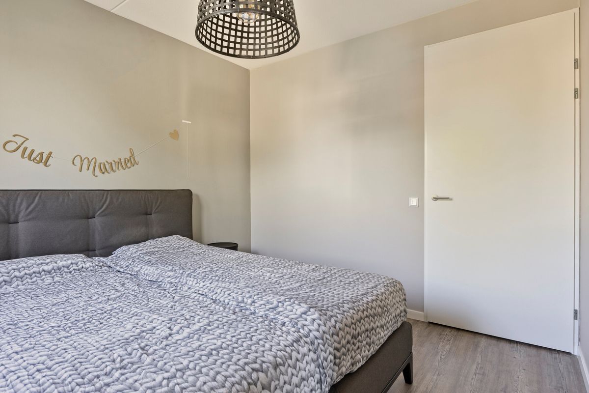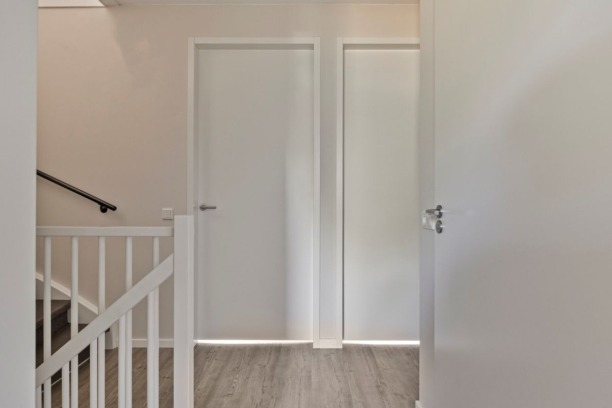 Vanuit de overloop zijn 3 slaapkamers, waarvan 1 met inloopkast, de badkamer en de trapopgang naar de tweede verdieping bereikbaar. De badkamer is grotendeels betegeld en v.v. een dubbele wastafel met meubel, een hangend toilet, een ligbad, inloopdouche en een designradiator. De vloer van overloop en de slaapkamers is v.v. pvc. De wanden zijn afgewerkt met stucwerk en de plafonds met spuitwerk. De kozijnen zijn van hout met HR++ glas en v.v. houten luiken en rolhorren.