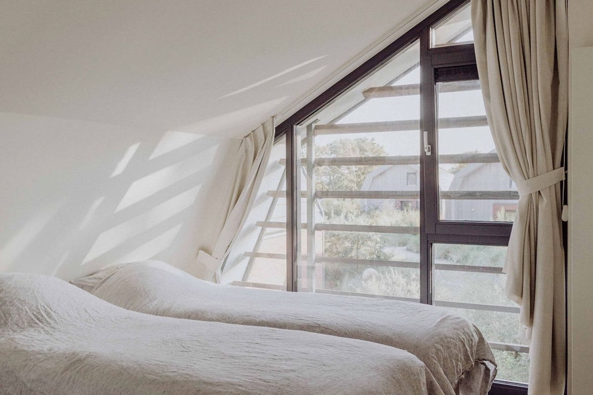 De trap in de woonkamer leidt naar de eerste verdieping, waar zich drie lichte slaapkamers bevinden met comfortabele bedden. Twee slaapkamers hebben elk twee bedden van 80 x 210 cm, en de derde slaapkamer heeft twee bedden van 80 x 200 cm. De royale bedden zijn opgemaakt met fijn linnengoed van ByMølle. Elke slaapkamer heeft een insecten hor aan de buitenkant van de ramen die open kunnen. De verduisterende gordijnen maken een middagdutje perfect mogelijk.