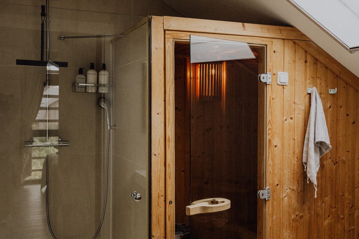 Je kunt ook heerlijk ontspannen in je eigen Finse sauna in de badkamer. De badkamer, die is voorzien van vloerverwarming, heeft een regendouche en een wastafel met grote spiegel. In de hal bevindt zich een apart toilet.