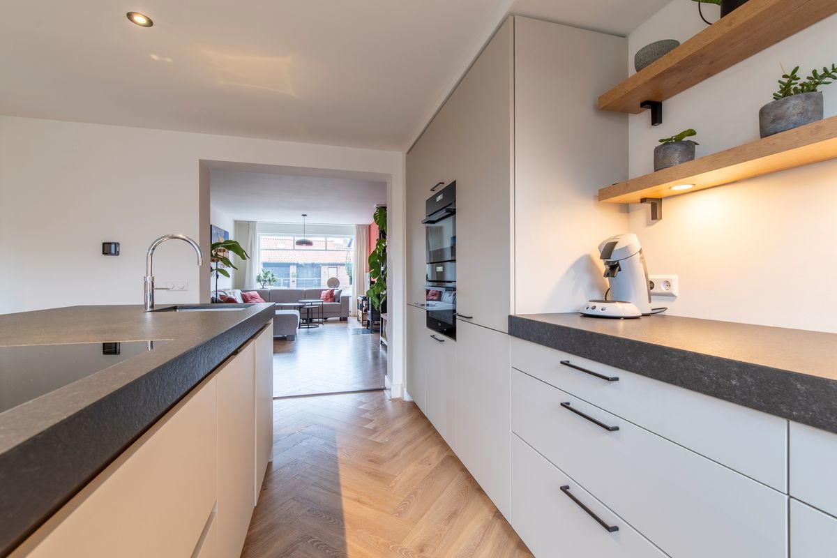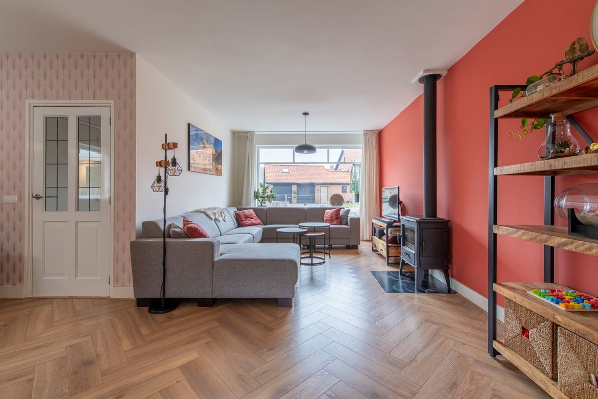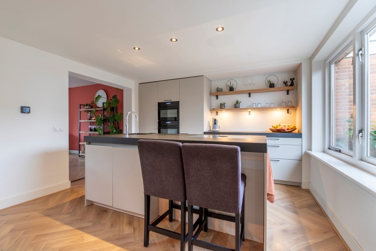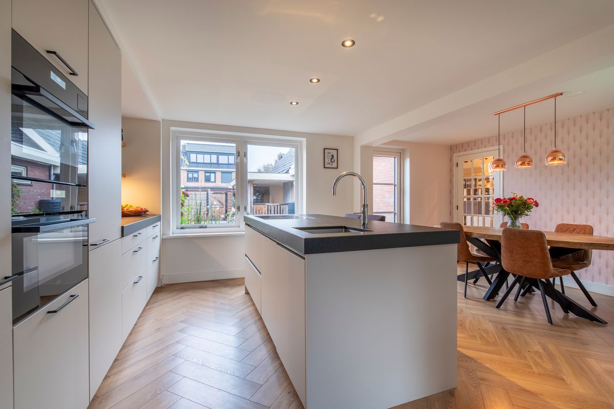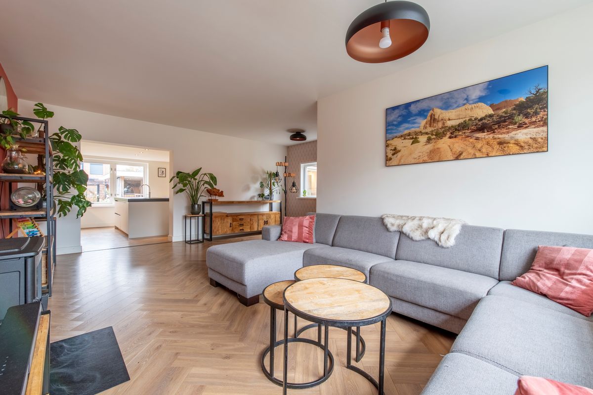 Begane grond: Via de voordeur bekijken we als eerste de hal. In de hal zien we de trap naar de eerste verdieping en deuren naar het toilet en de trapkast. Wanneer we verder lopen komen we aan in de L-vormige woonkamer. Deze woonkamer, die een houtkachel heeft, geeft een leuk zicht op het straatbeeld. Anderzijds geeft de L-vormige indeling goede mogelijkheden voor een fijn speelhoekje voor de kinderen. Vervolgens komen we aan in de woonkeuken. In deze woonkeuken is in 2020 nog een nieuwe keukeninrichting geplaatst. Deze keukeninrichting heeft een kookeiland, een natuurstenen aanrechtblad en aan inbouwapparatuur is niet alleen een inductie kookplaat met Bora werkbladafzuiging voorzien. Ook aanwezig zijn een grote koelkast, een grote vriezer, een stoomoven, een combi-oven, een vaatwasser en een Quooker. Alle inbouwapparatuur betreft A-merken van hoge kwaliteit. Een deur geeft toegang tot de algemene ruimte. Deze algemene ruimte heeft een kleine(re) (slaap)kamer aan de voorkant, deze slaapkamers is op dit moment ni gebruik als wasruimte. Ook zijn er dubbele deuren naar de tuin. Verder gelopen komen we aan in de berging. Deze berging heeft een trap naar de zolder. Tenslotte is er toegang tot de tuinkamer. Vrijwel de gehele vloer van de begane grond is afgewerkt met laminaat, de tuinkamer heeft plavuizen.