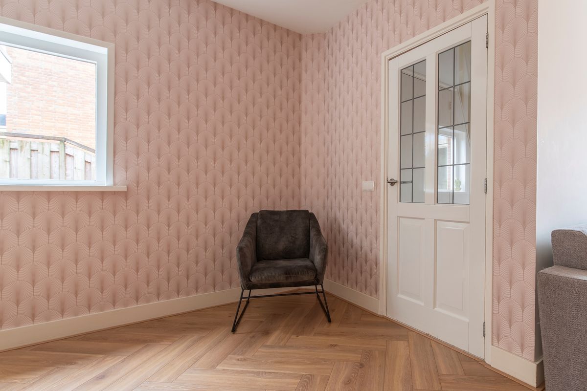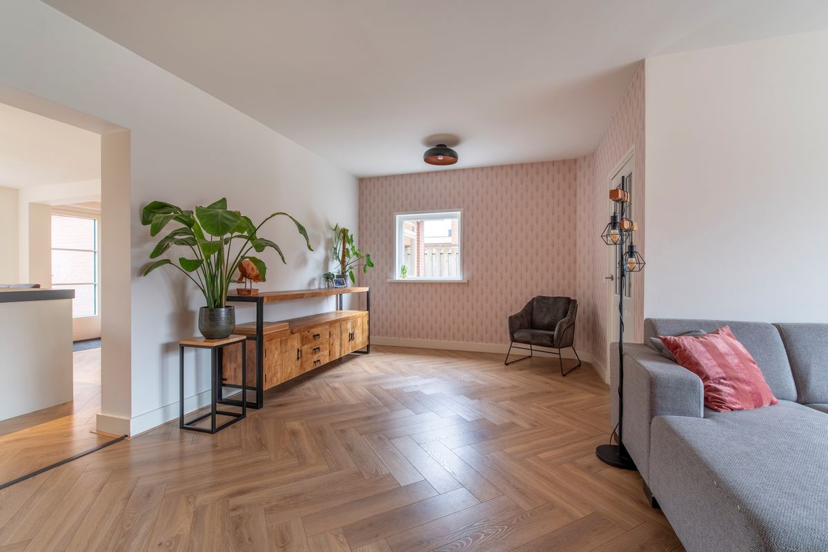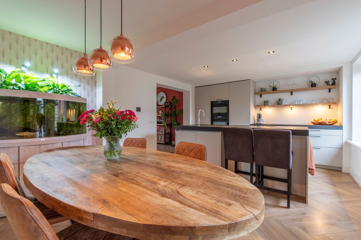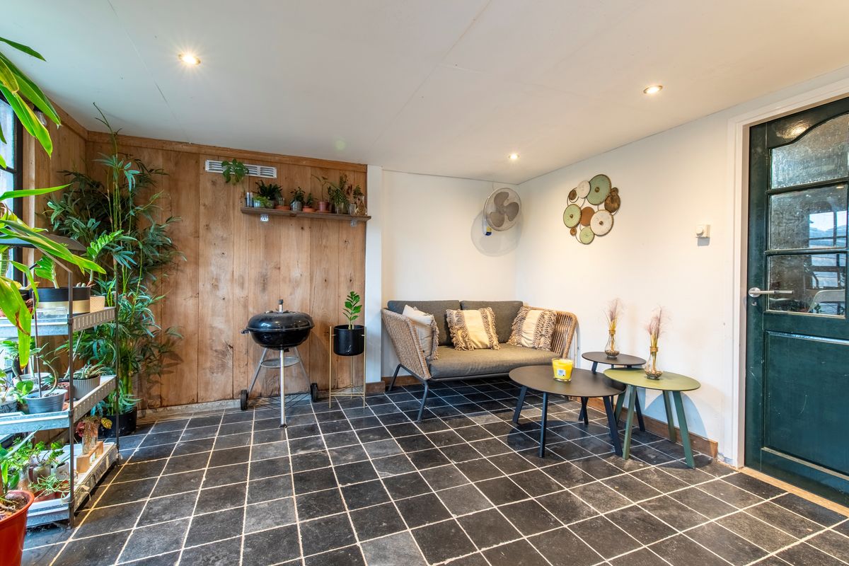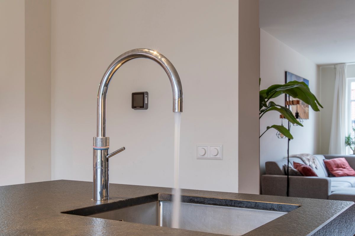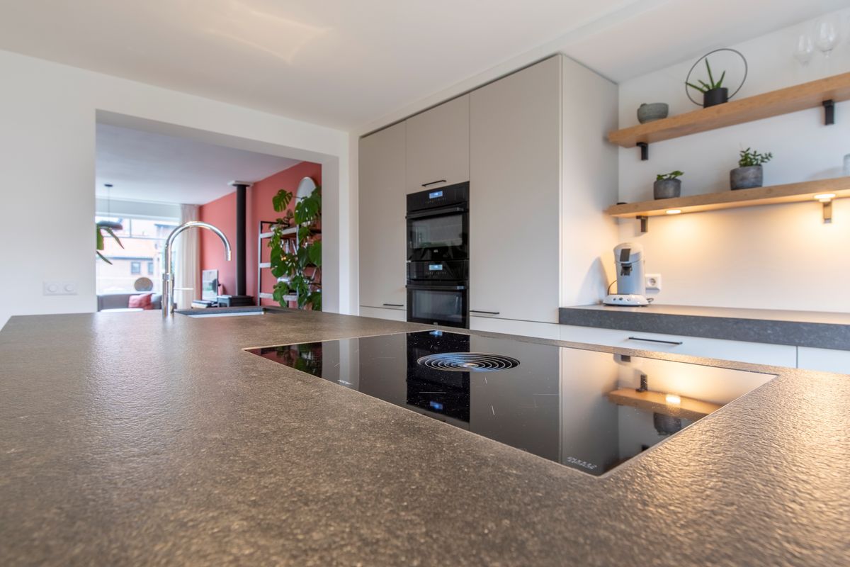 Begane grond: Via de voordeur bekijken we als eerste de hal. In de hal zien we de trap naar de eerste verdieping en deuren naar het toilet en de trapkast. Wanneer we verder lopen komen we aan in de L-vormige woonkamer. Deze woonkamer, die een houtkachel heeft, geeft een leuk zicht op het straatbeeld. Anderzijds geeft de L-vormige indeling goede mogelijkheden voor een fijn speelhoekje voor de kinderen. Vervolgens komen we aan in de woonkeuken. In deze woonkeuken is in 2020 nog een nieuwe keukeninrichting geplaatst. Deze keukeninrichting heeft een kookeiland, een natuurstenen aanrechtblad en aan inbouwapparatuur is niet alleen een inductie kookplaat met Bora werkbladafzuiging voorzien. Ook aanwezig zijn een grote koelkast, een grote vriezer, een stoomoven, een combi-oven, een vaatwasser en een Quooker. Alle inbouwapparatuur betreft A-merken van hoge kwaliteit. Een deur geeft toegang tot de algemene ruimte. Deze algemene ruimte heeft een kleine(re) (slaap)kamer aan de voorkant, deze slaapkamers is op dit moment ni gebruik als wasruimte. Ook zijn er dubbele deuren naar de tuin. Verder gelopen komen we aan in de berging. Deze berging heeft een trap naar de zolder. Tenslotte is er toegang tot de tuinkamer. Vrijwel de gehele vloer van de begane grond is afgewerkt met laminaat, de tuinkamer heeft plavuizen.
