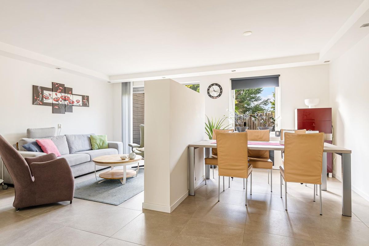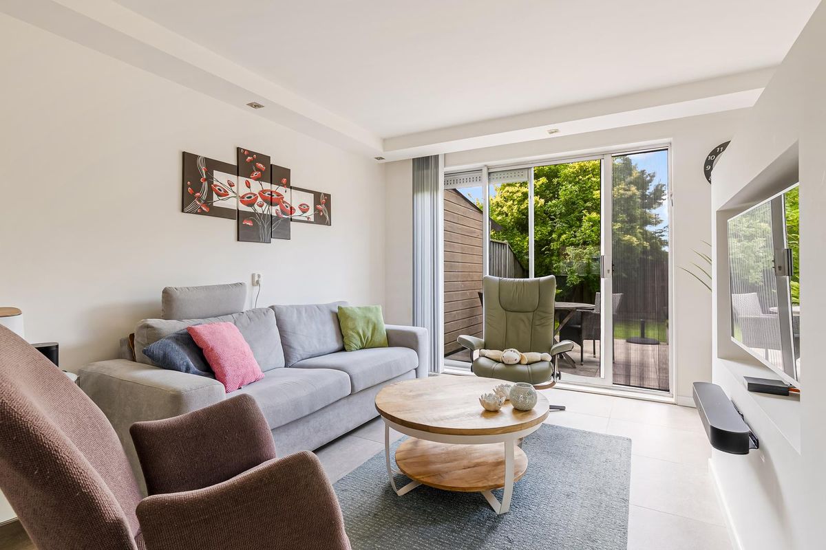 Ruime, lichte woonkamer met schuifpui, moderne plavuizen vloer met vloerverwarming en toegang tot de zonnige achtertuin.