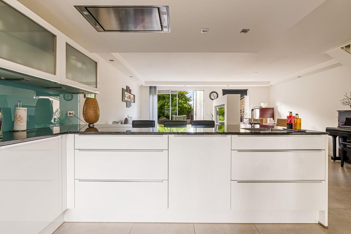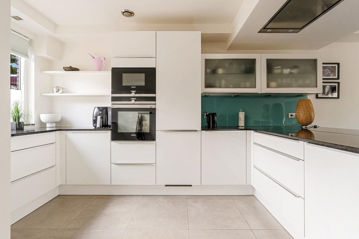 Aan de voorzijde bevindt zich de luxe keuken (2018) in U-opstelling, voorzien van Siemens-inbouwapparatuur waaronder inductiekookplaat, oven, magnetron, vaatwasser, koelkast en afzuigkap met afstandsbediening.