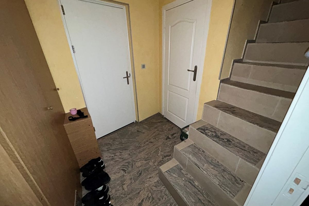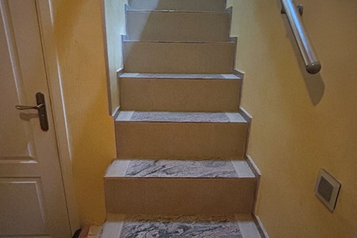 Entree/hal 2,30 x 2,00 met granieten vloer, deur naar woonkamer en toiletruimte en trap met granieten treden naar verdieping.
