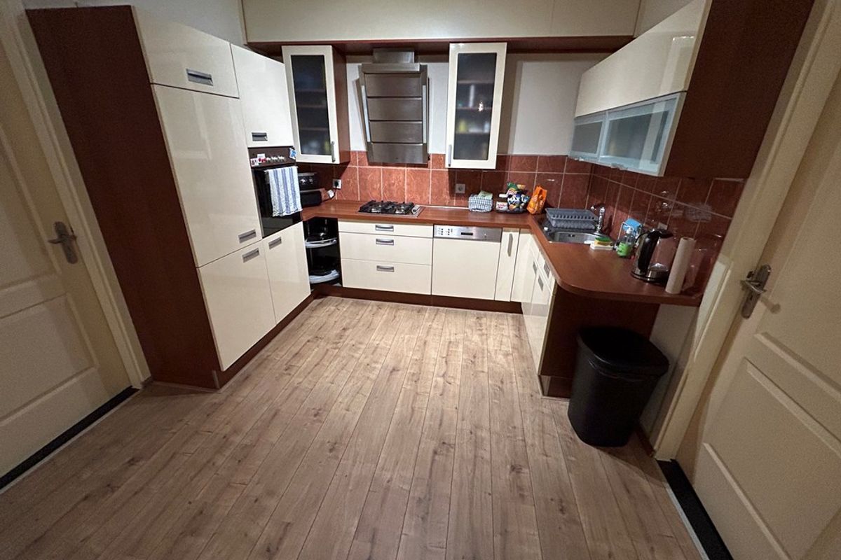 Keuken 3,35 x 3,15 met laminaatvloer, deur naar beide slaapkamers en mooie hoogglans aanbouwkeuken met 4-pits gasfornuis met moderne afzugunit, vaatwasser, heteluchtoven, koel/vriescombinatie, draaideurcarrousel, apothekerskastje en spoelbak.