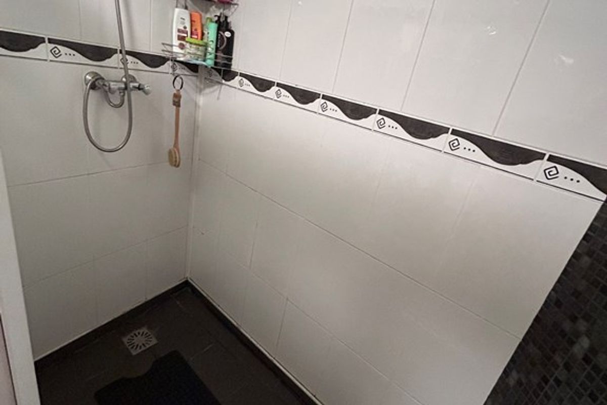 Badkamer 3,10 x 1,60 met mozaïekvloer, inloopdouche, badkamermeubel met wastafel, aansluitingen was-apparatuur en design radiator.