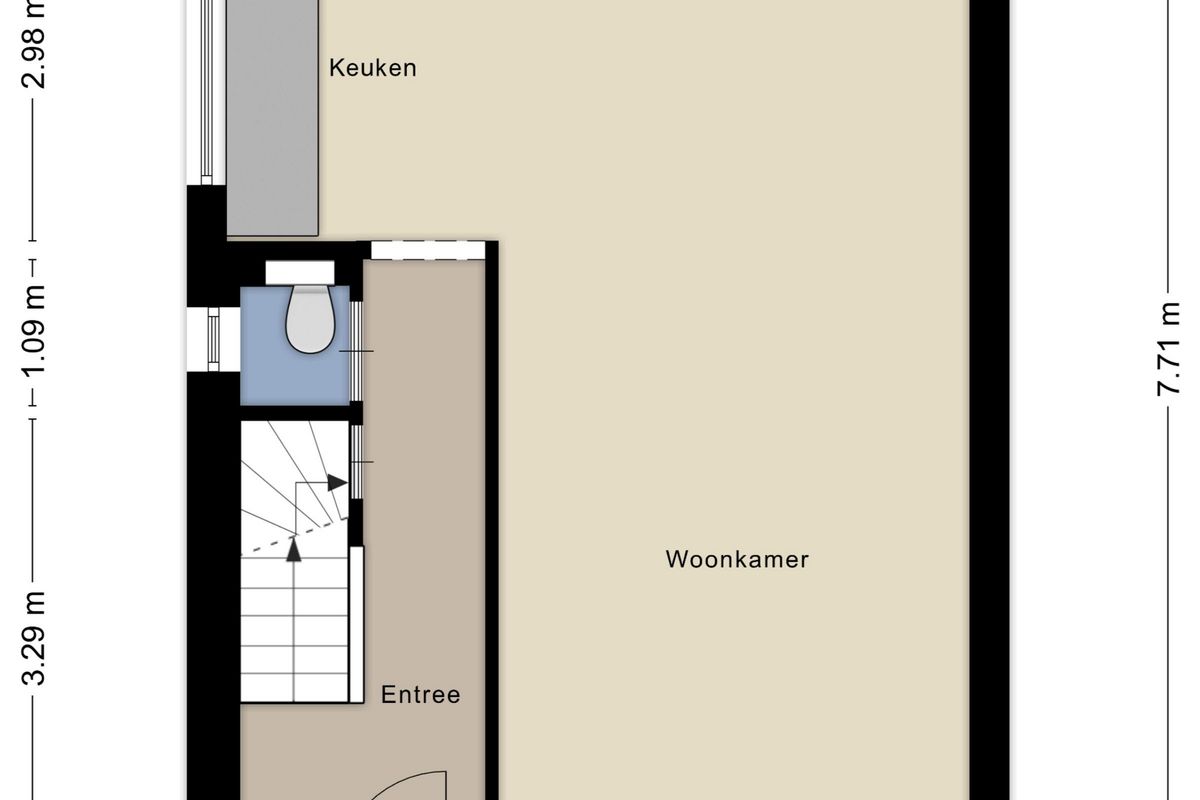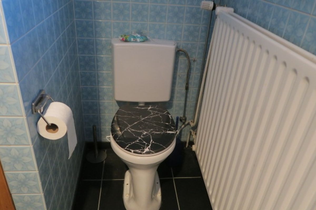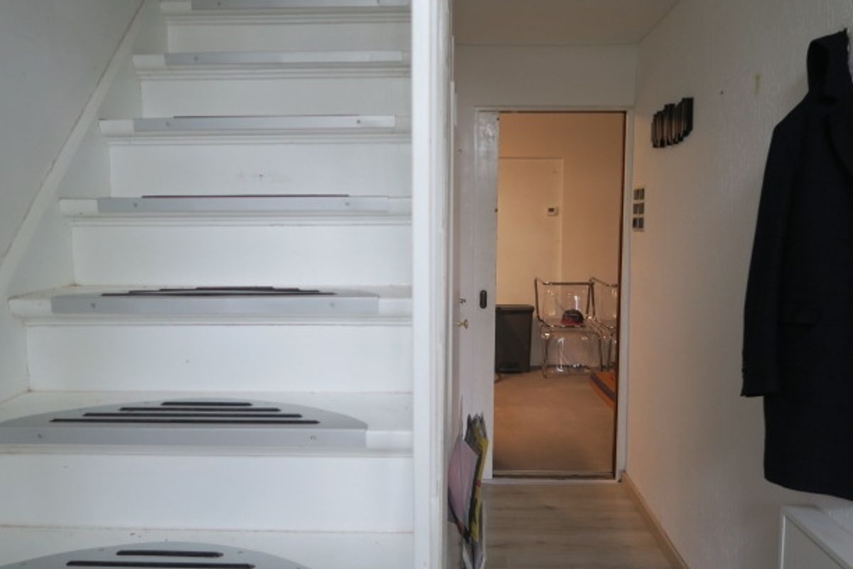 Overdekte entree, hal met meterkast, trappenhuis, toilet en toegang tot de keuken. Moderne toiletruimte met wandcloset en fonteintje.