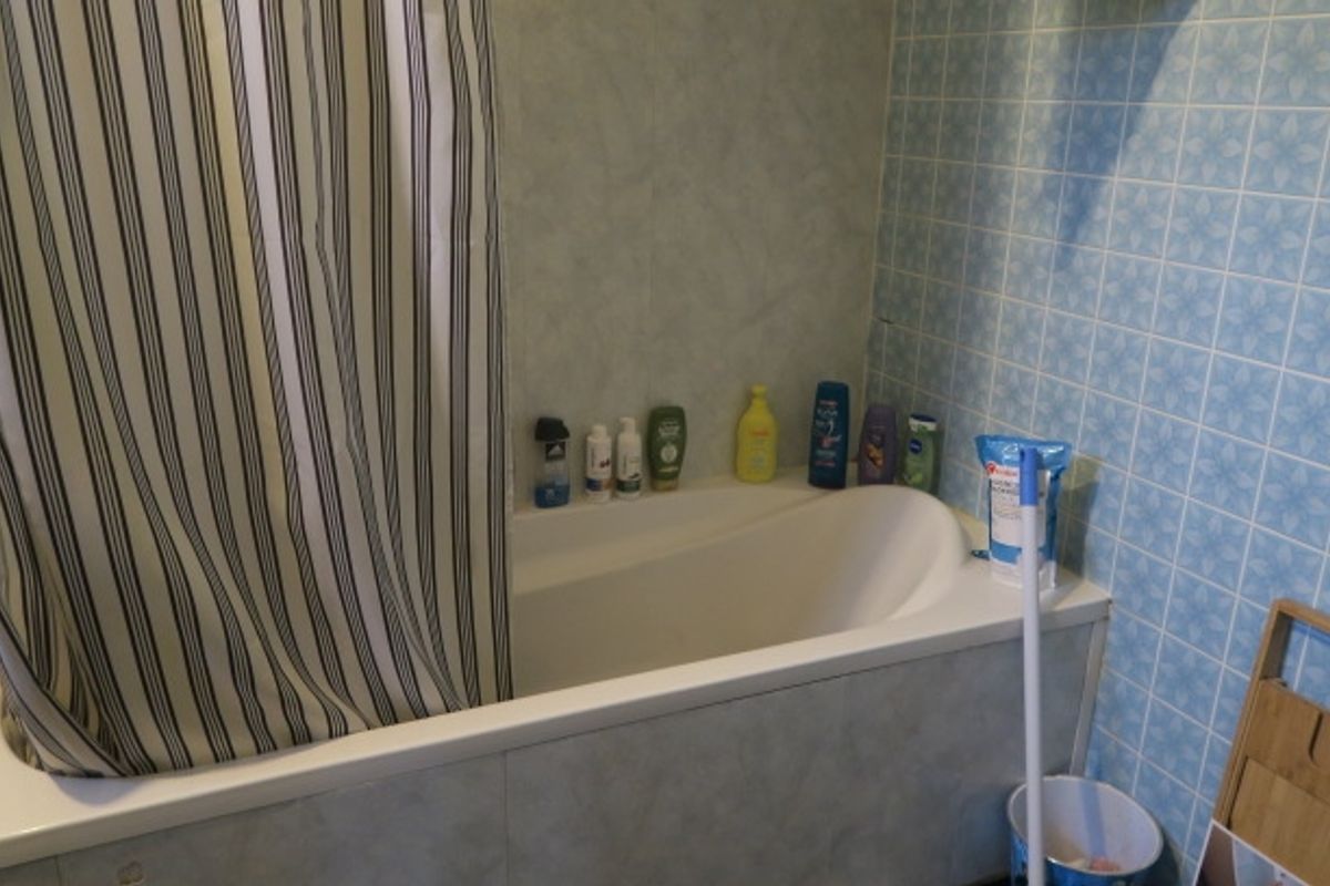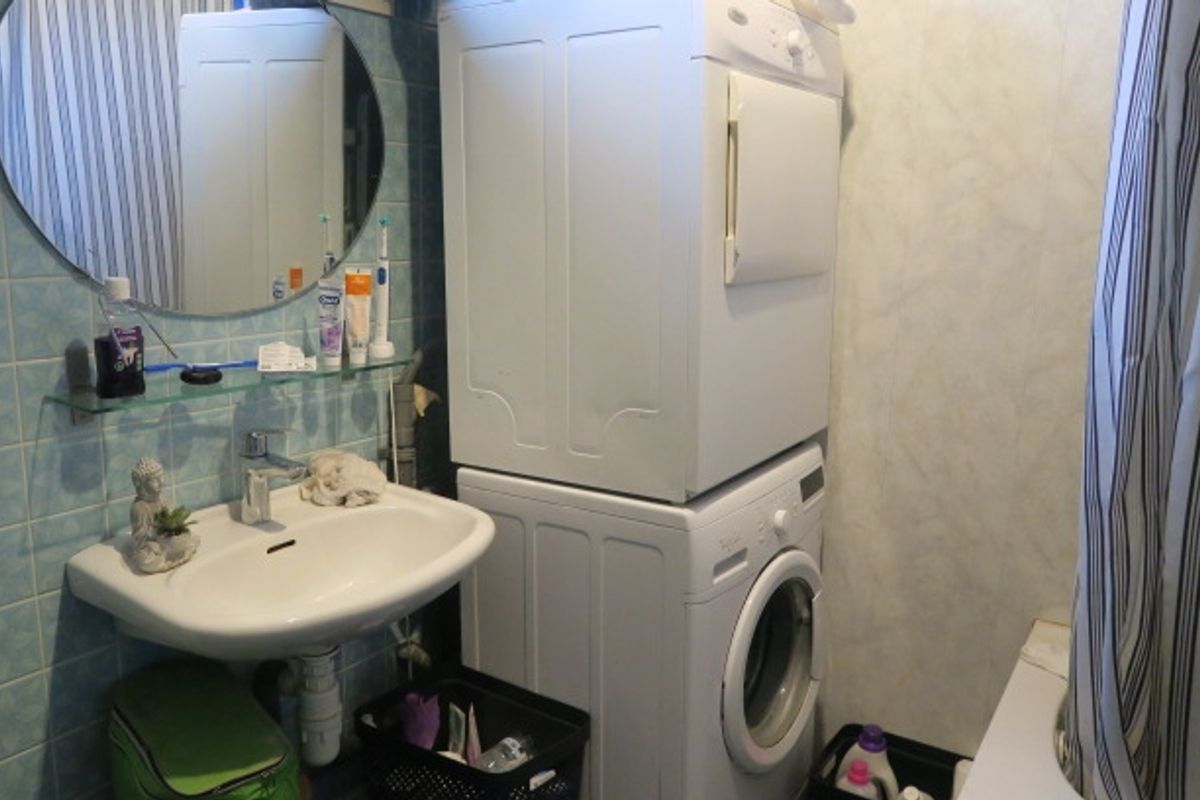 Overloop met toegang tot 2 slaapkamers en de badkamer. De badkamer is grotendeels betegeld en voorzien van een staand toilet, wastafel met mengkraan, een douche/ligbadcombi met thermostaatkraan en de opstelplaats voor witgoed.