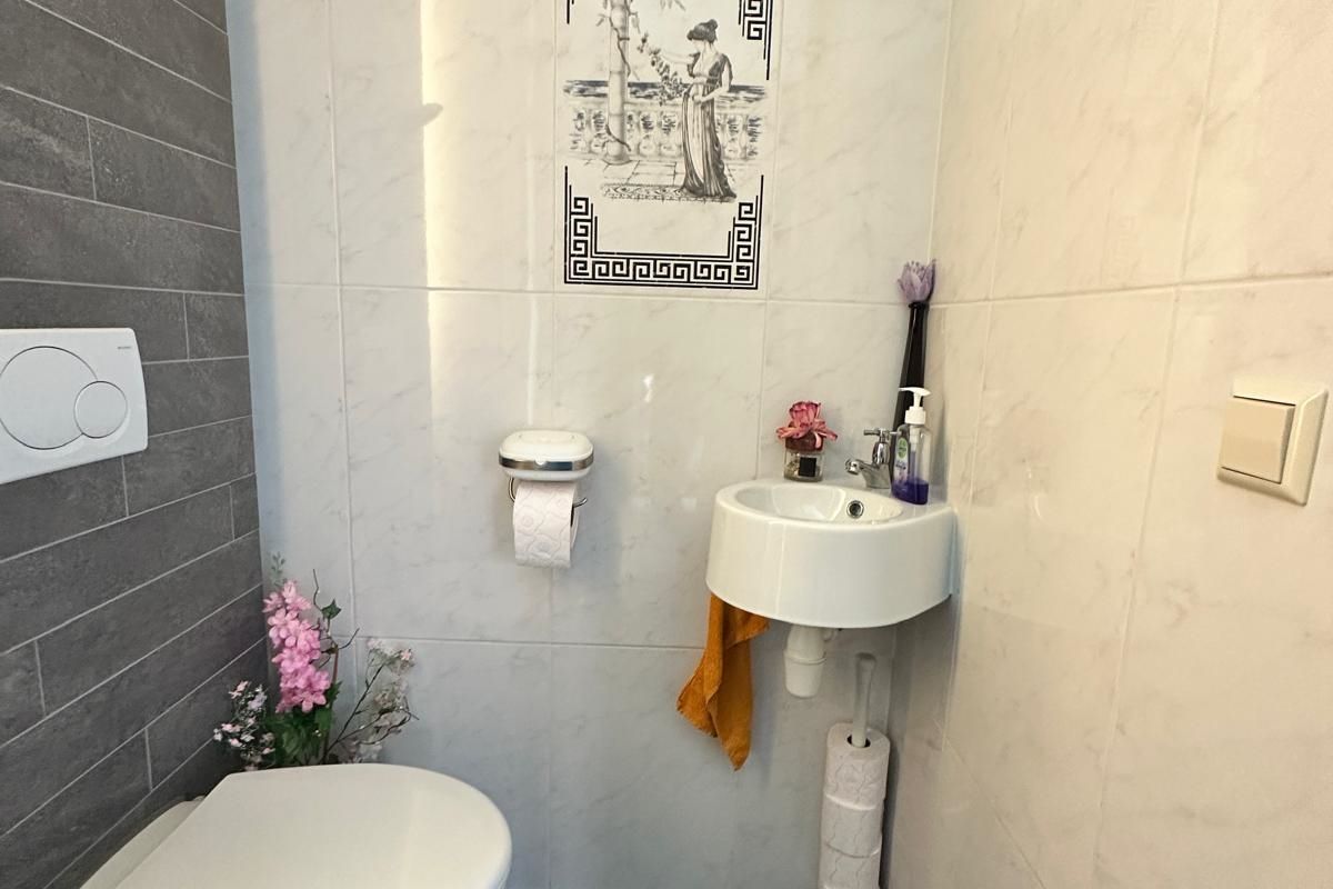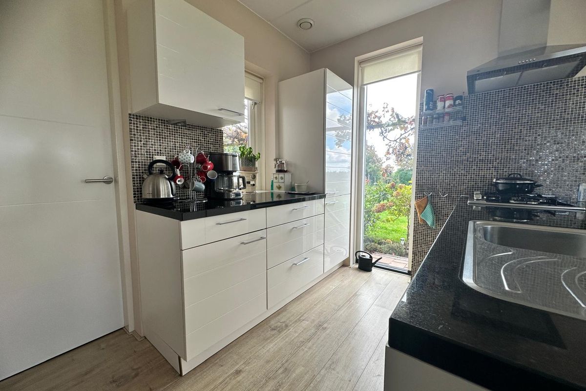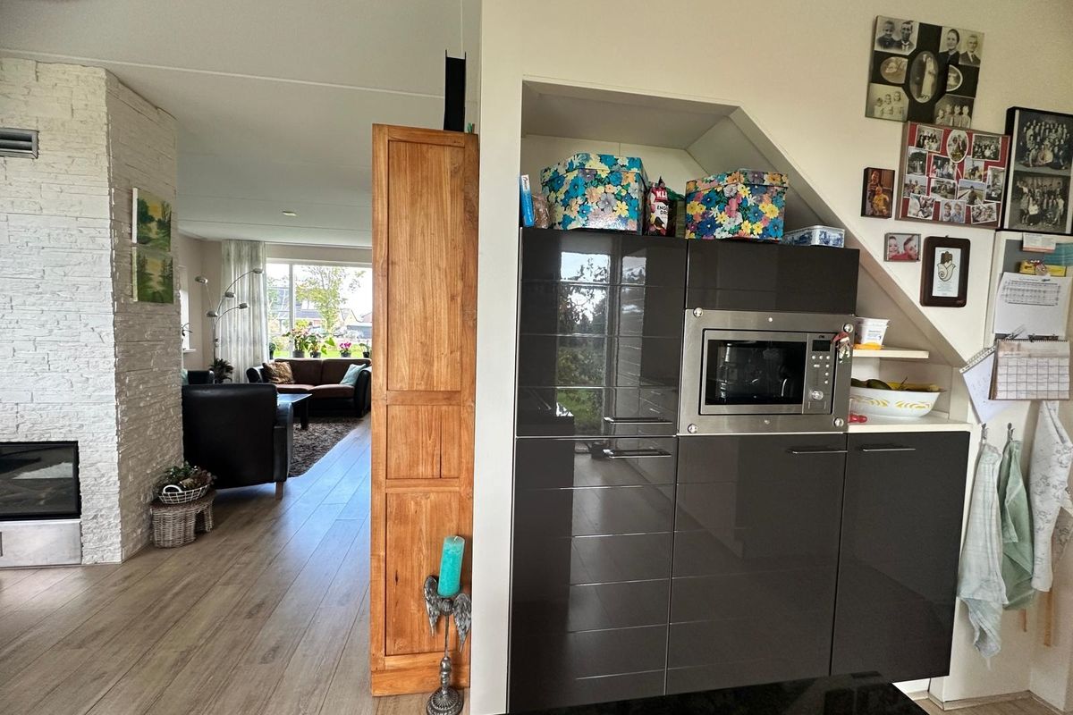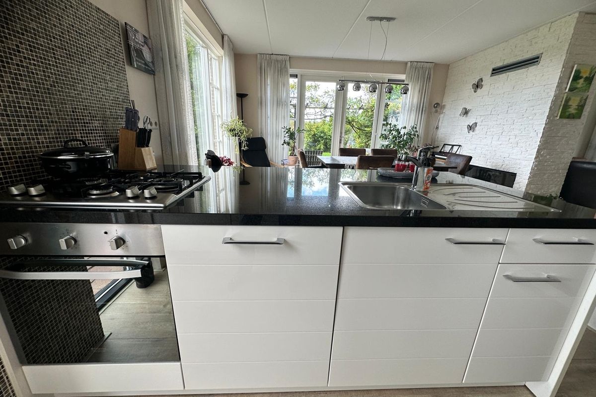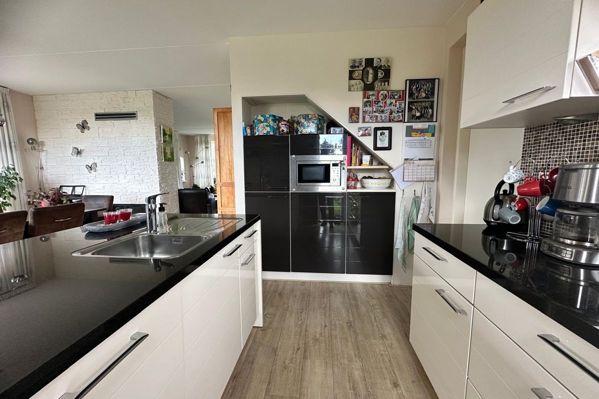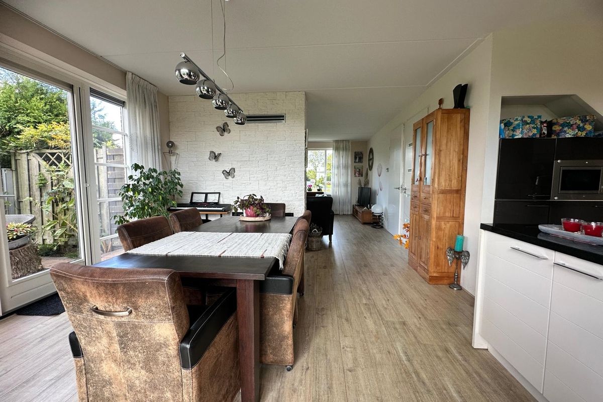 Via de hal stap je binnen in deze comfortabele woning. Hier vind je ook het gastentoilet. Vanuit de hal kom je in de ruime woonkamer met halfopen moderne keuken en kookeiland. De keuken is volledig uitgerust en voorzien van alle gemakken: vaatwasser, oven, magnetron, grote koelkast en vriezer. Aan de eettafel geniet je van een prachtig uitzicht over de tuin.