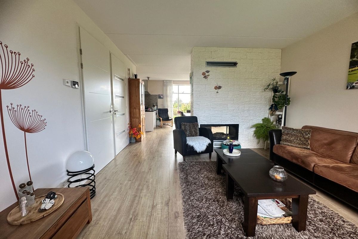 De sfeervolle open haard, ingebouwd in de scheidingswand tussen keuken en woonkamer, zorgt voor warmte en gezelligheid in beide ruimtes. De woonkamer is ingericht met twee comfortabele banken, een salontafel en televisie, een fijne plek om samen te ontspannen.