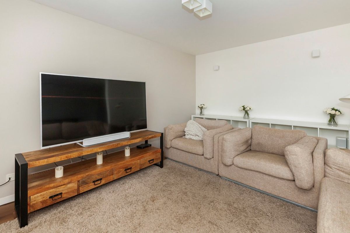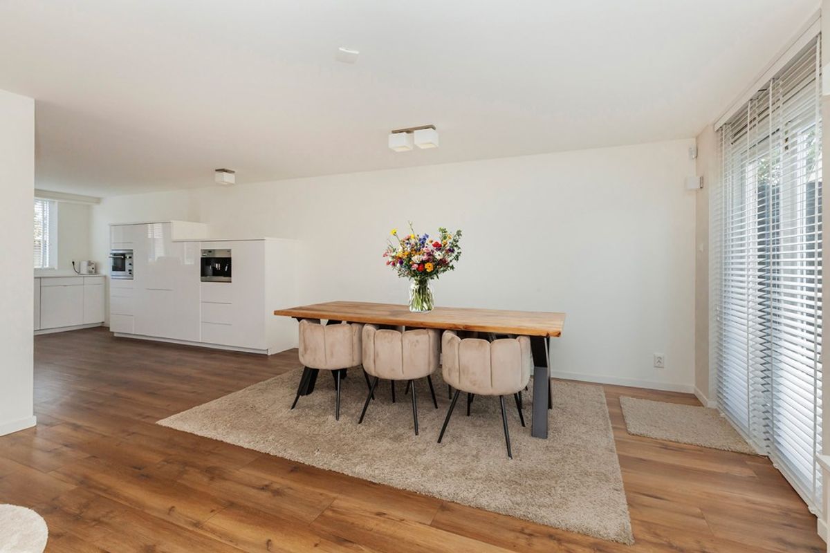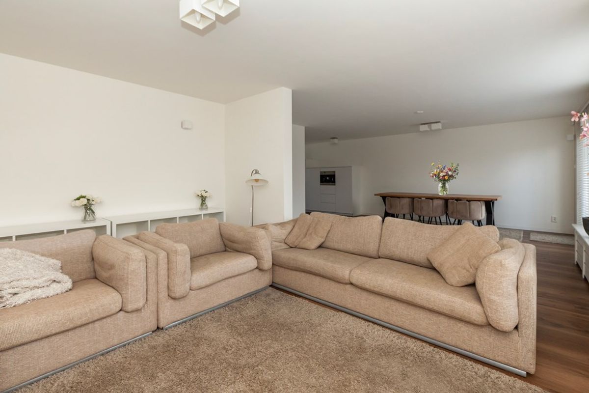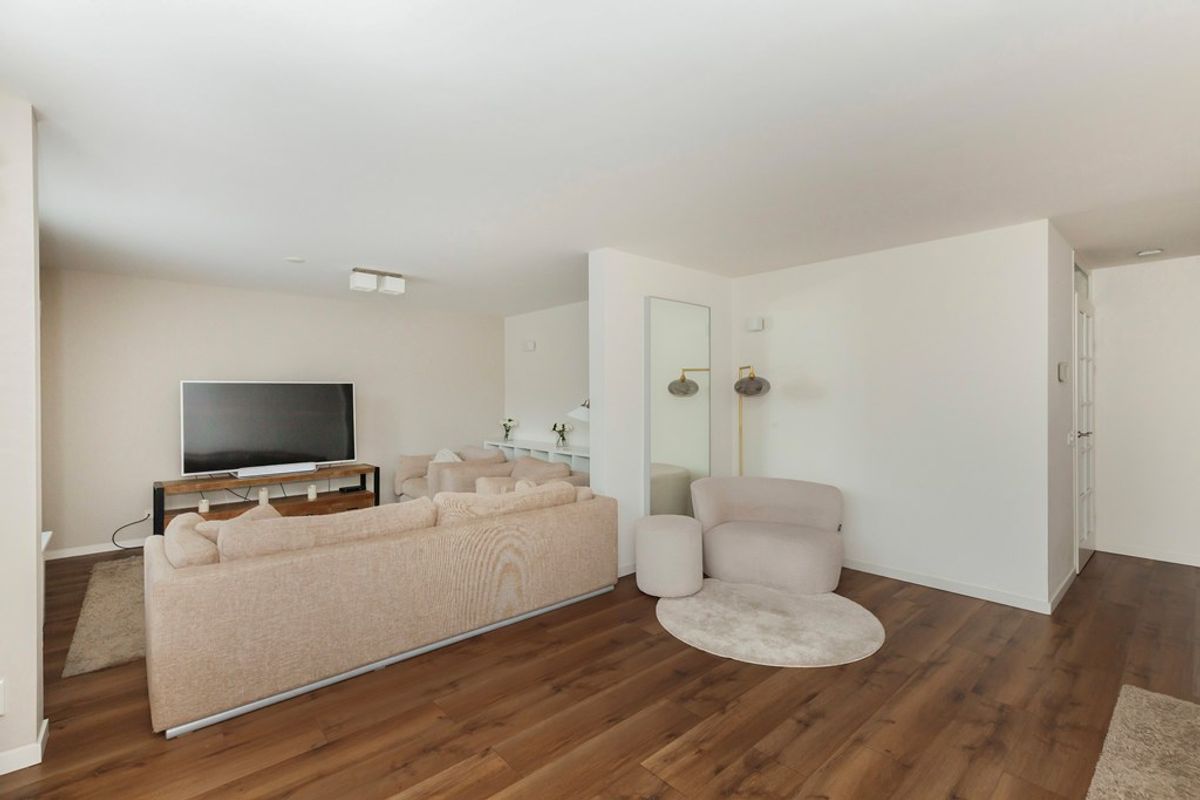 De ruime woonkamer is vergroot, strak afgewerkt met glad gestucte wanden en plafonds, en voorzien van een fraaie pvc-vloer met vloerverwarming. Dankzij de grote raampartijen geniet de woonkamer van veel lichtinval.