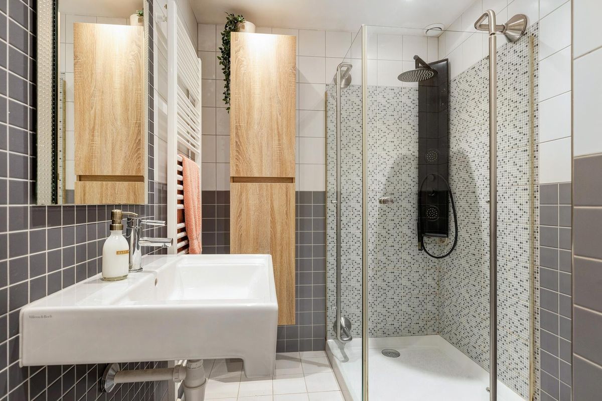 Badkamer: Fraai betegeld, met een douchecabine, wastafelmeubel en designradiator en aansluitingen voor wasmachine en droger – strak, modern en praktisch.