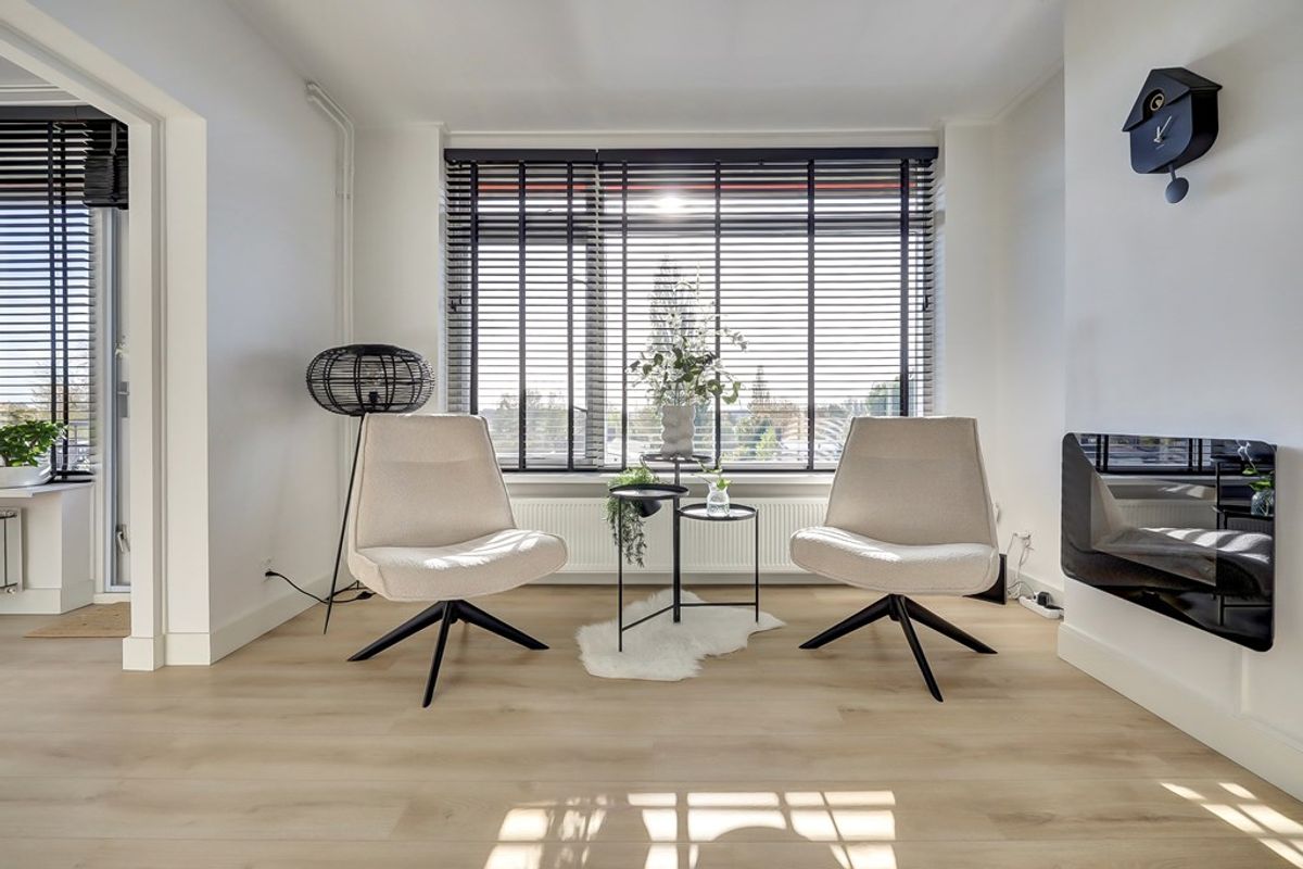 de royale, strakke en toch sfeervolle — aan de voorzijde gelegen — woonkamer (ca. 29 m², met laminaatvloer, zonwering, glad gestuukte wanden en toegang tot het zonnige, op het zuiden gesitueerde balkon van 4 m²),