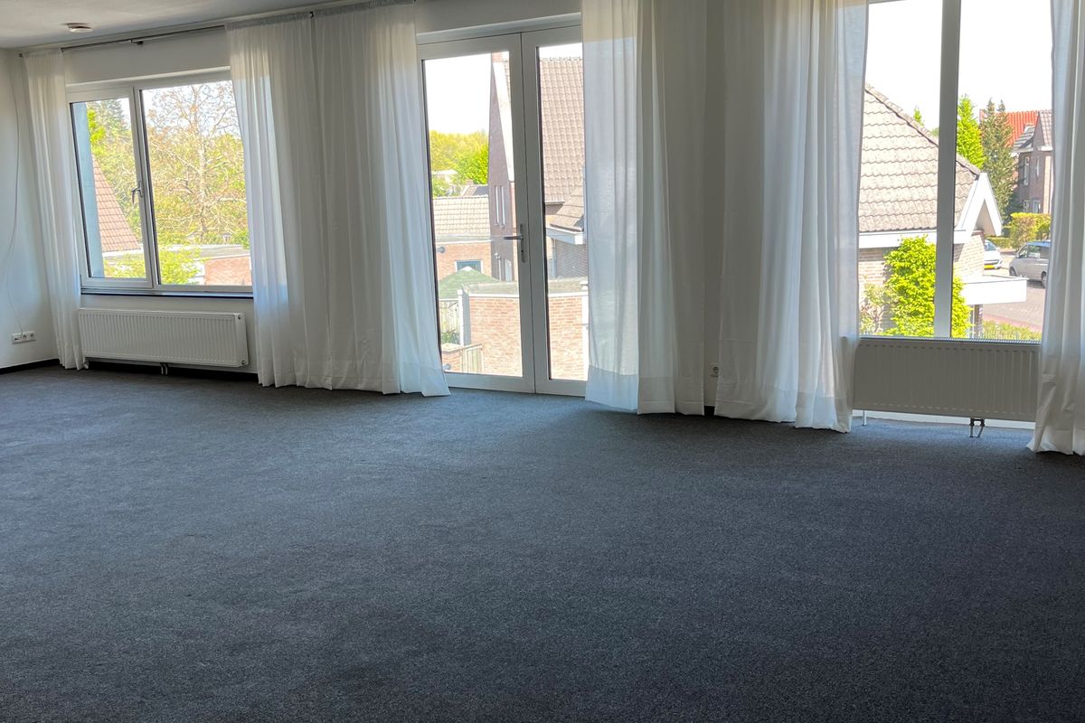 De riante woonkamer is voorzien van een intercominstallatie, gestucadoorde wanden en spuitwerk plafond. De woonkamer van ca. 55 m² heeft grote raampartijen en geniet daardoor van veel lichtinval en een prettig vergezicht. De raampartijen zijn eveneens voorzien van openslaande deuren naar het frans balkon.