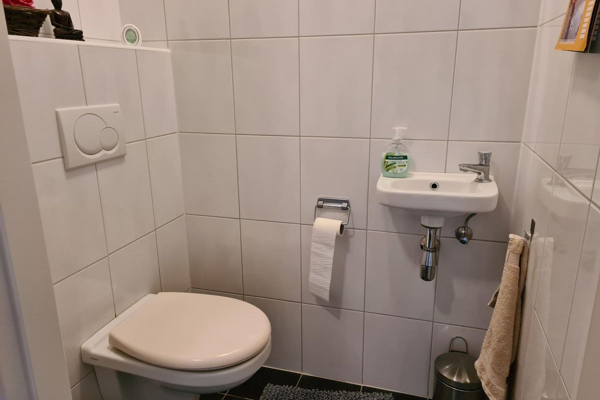 Vanuit de hal heeft u tevens toegang tot het geheel betegelde vrijhangend toilet met fonteintje.