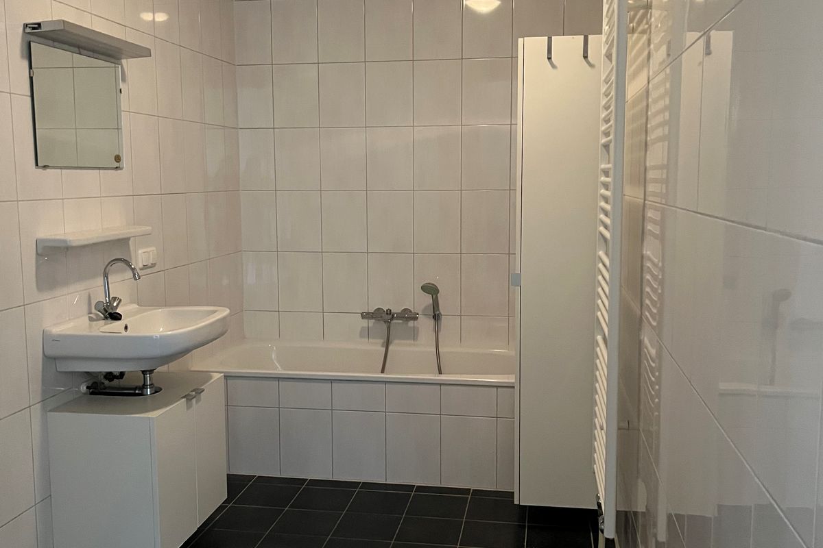 De nette badkamer is volledig betegeld en beschikt over een ligbad, inloopdouche, wastafel met planchet en spiegel en design radiator.