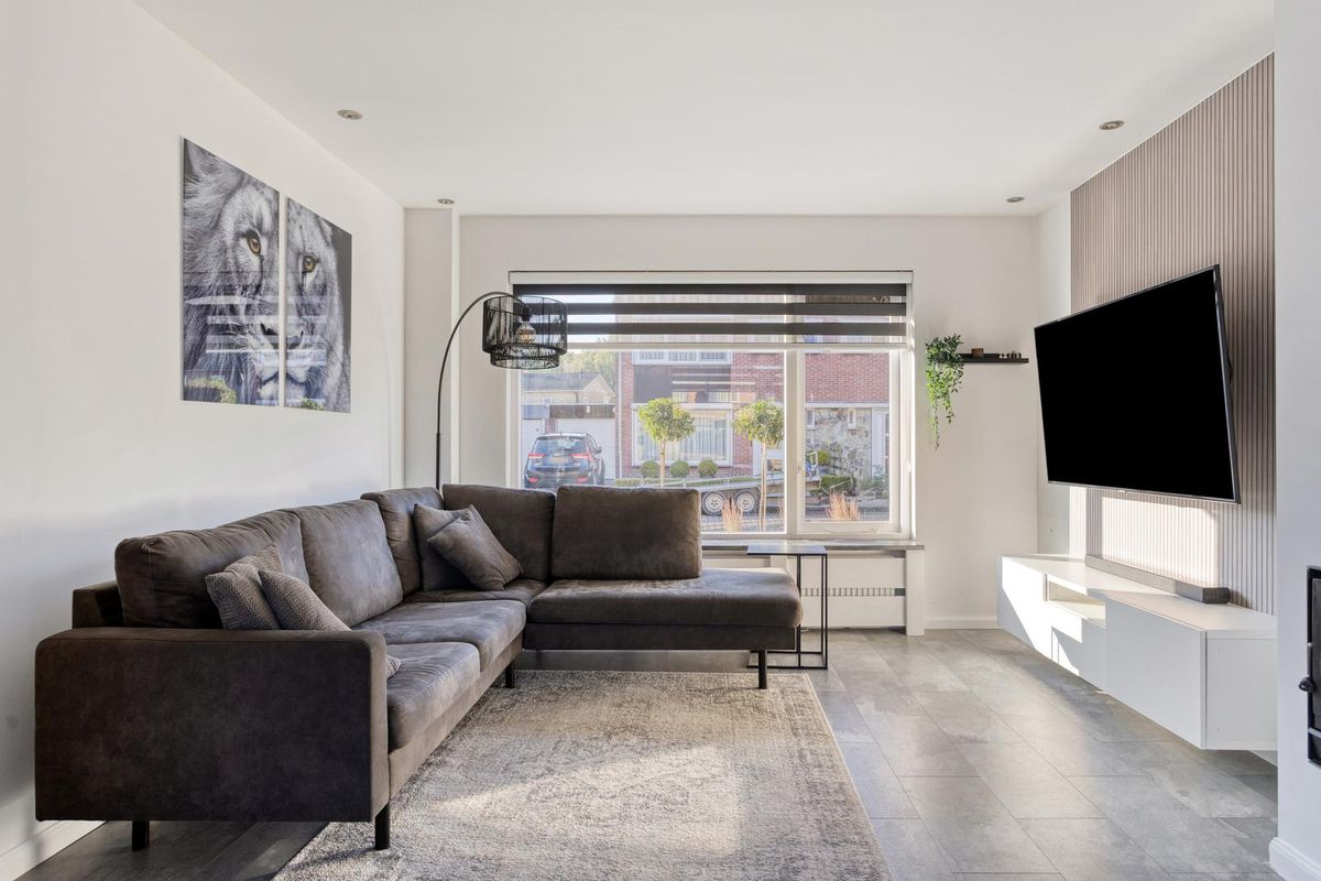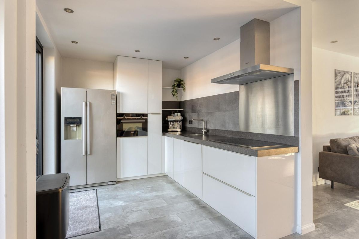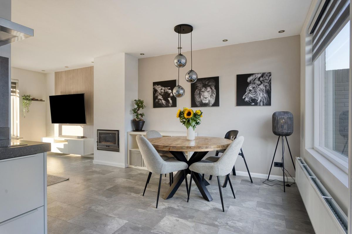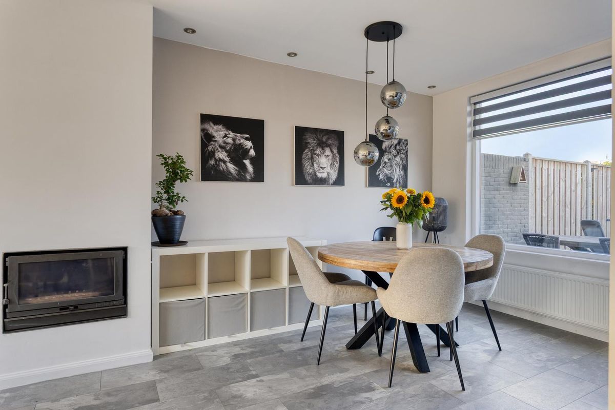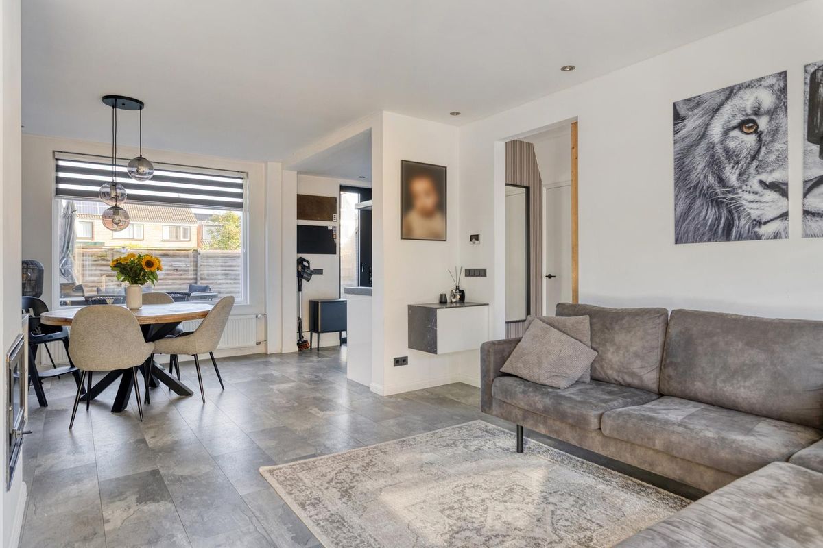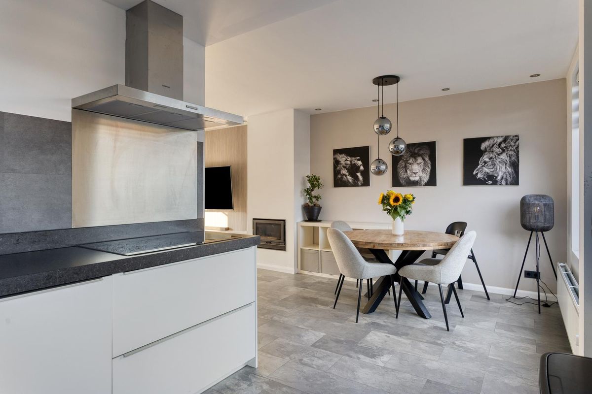 Bij binnenkomst stap je de hal binnen, die toegang biedt tot de trap naar de eerste verdieping, een provisiekast, het toilet en de meterkast. Vanuit de hal loop je door naar de lichte doorzonkamer, waar grote ramen zorgen voor veel daglicht en de haard voor een warme, gezellige sfeer in de wintermaanden. De moderne open keuken in hoekopstelling is uitgerust met diverse inbouwapparatuur en biedt een fijne plek om te koken, terwijl je vanuit de keuken direct contact hebt met de tuin.