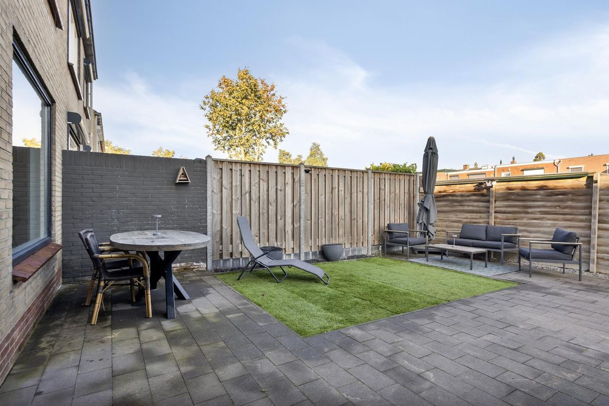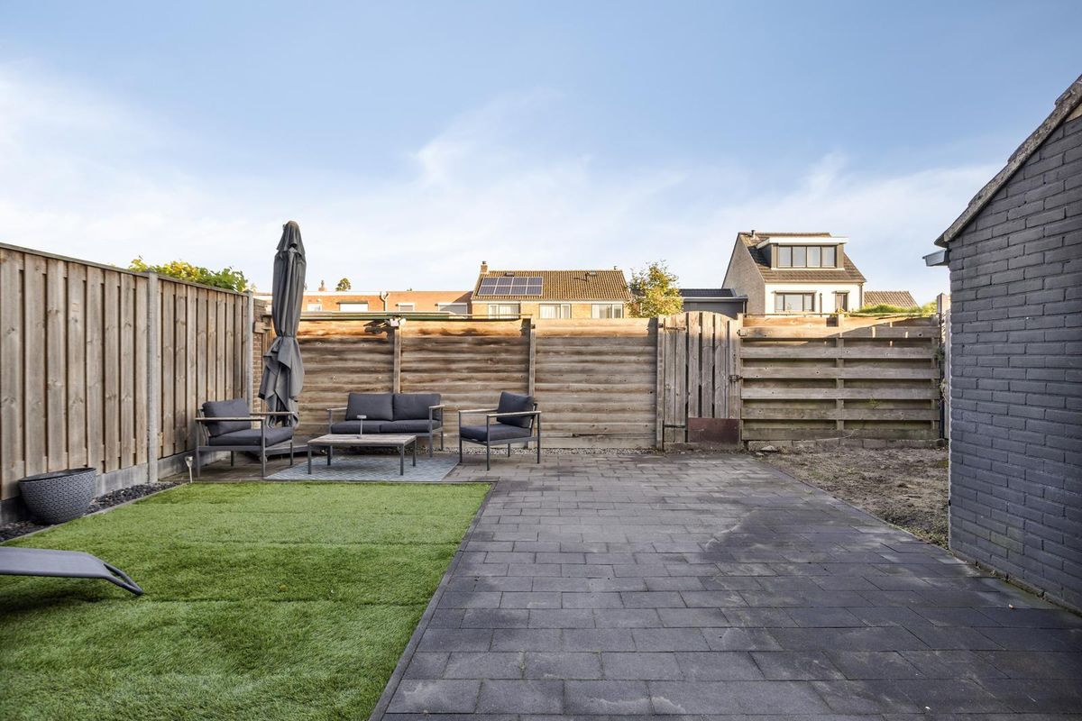 De achtertuin is onderhoudsvriendelijk ingericht en ligt op het noordwesten, waardoor je zowel van de ochtend- als van de middagzon kunt genieten. Een strak gazon wordt afgewisseld met gezellige terrassen, ideaal om te ontspannen, te spelen of te barbecueën. Dankzij de vrije achterom is de tuin bovendien gemakkelijk bereikbaar met de fiets of voor het opslaan van tuinspullen. De tuin biedt een prettige mix van privacy, zon en ruimte om buiten te leven.