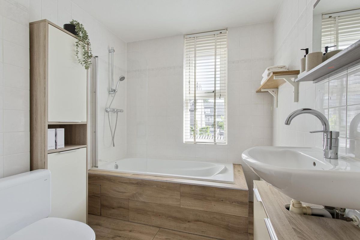 Geheel betegelde moderne badkamer (circa 2.20 x 2.17 m) met toilet, wastafel, wastafelmeubel, badkamerkast, ligbad met douchewand en een raam voor natuurlijke ventilatie en daglichttoetreding.