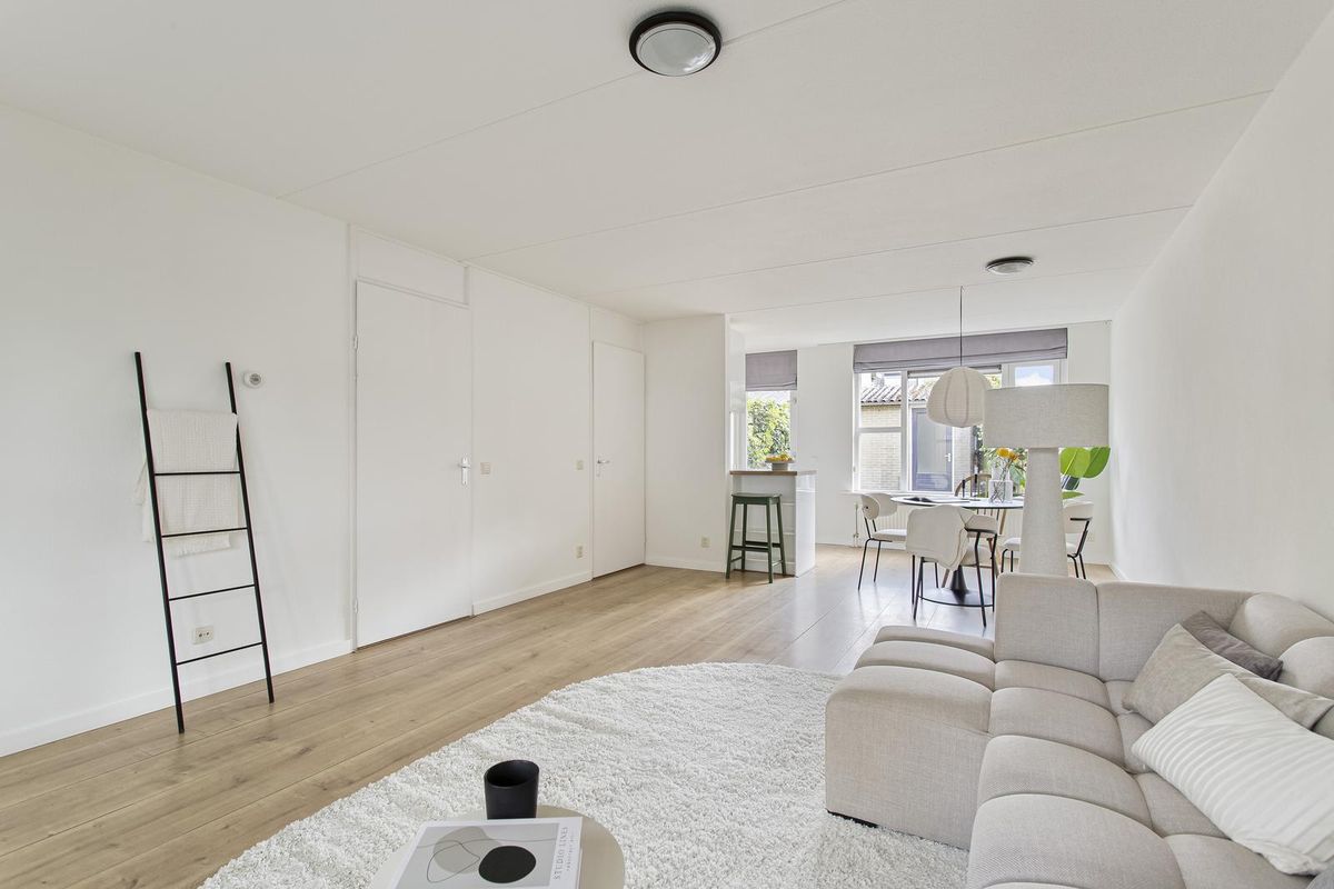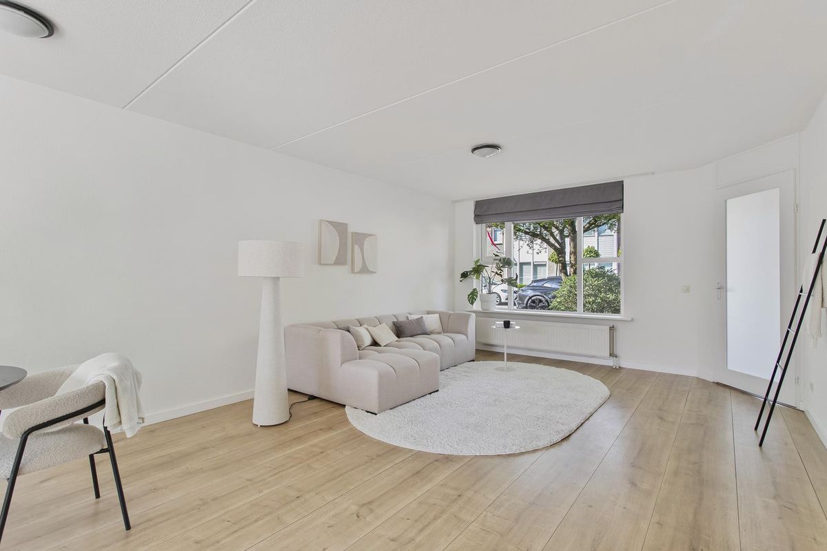 De woonkamer (circa 4.10/3.31 x 8.16 m) is voorzien van een laminaatvloer en biedt toegang tot een trapkast en portaaltje met trapopgang en toegang tot de half betegelde toiletruimte met toilet en fonteintje.