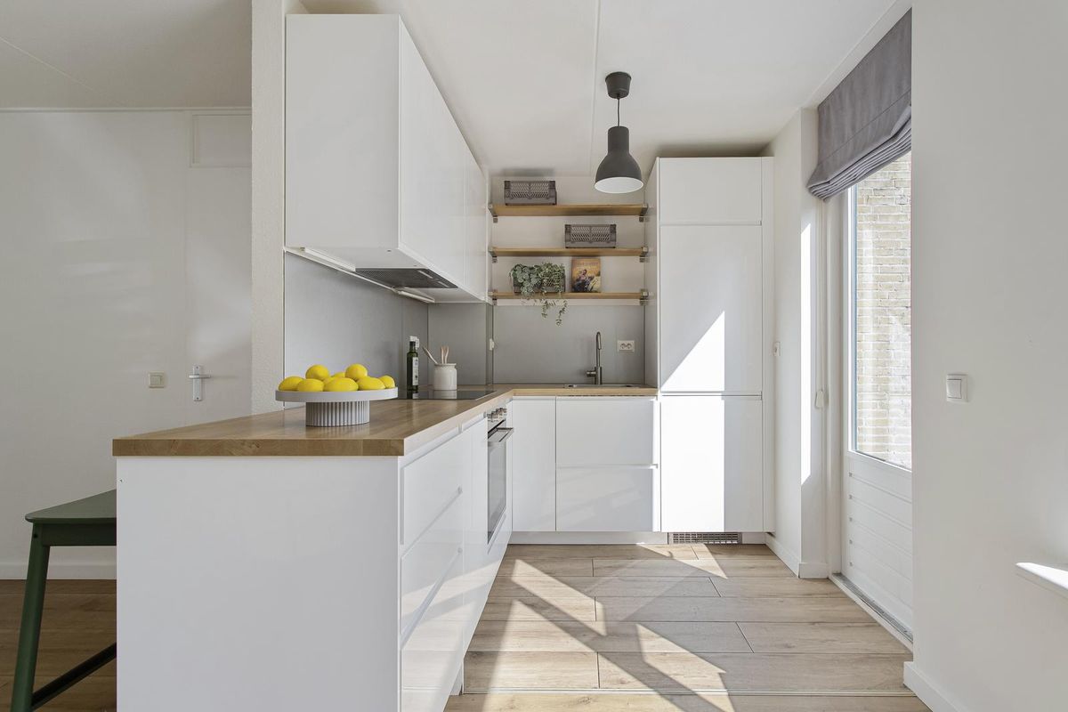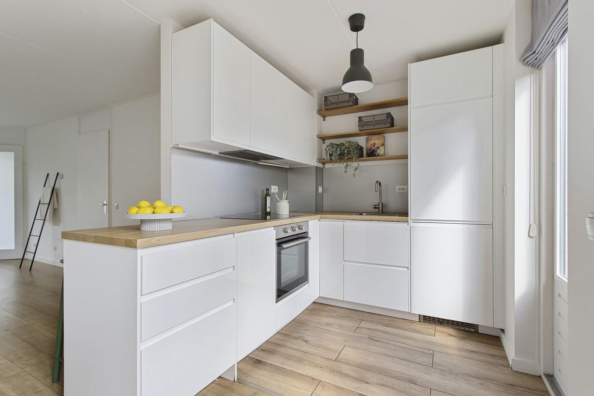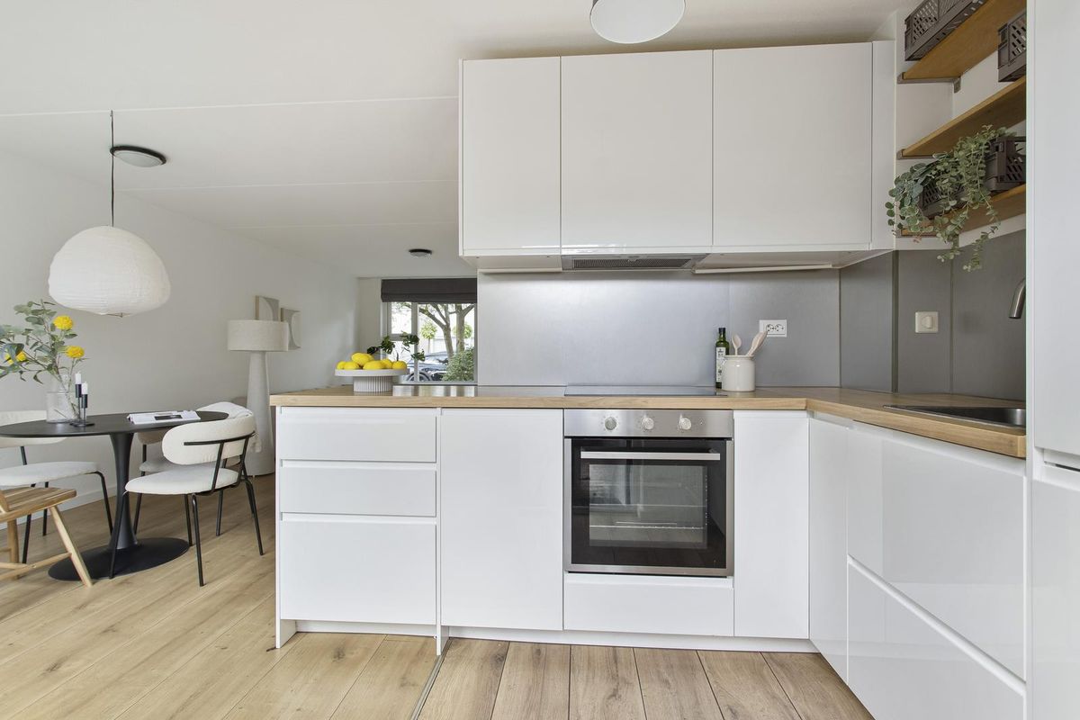 De half open keuken is onlangs volledig vernieuwd (2022) en voorzien van een L-vormige keukenopstelling met inductiekookplaat, afzuigkap, oven, vaatwasser, koelkast, vriezer, diverse kasten, waaronder een carrouselkast en pannen- en bestekladen.