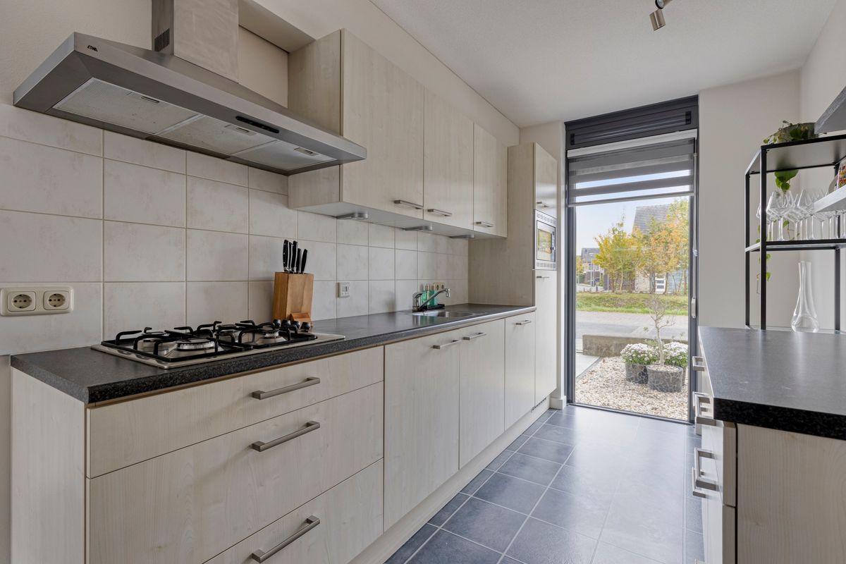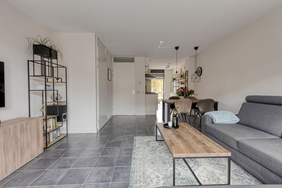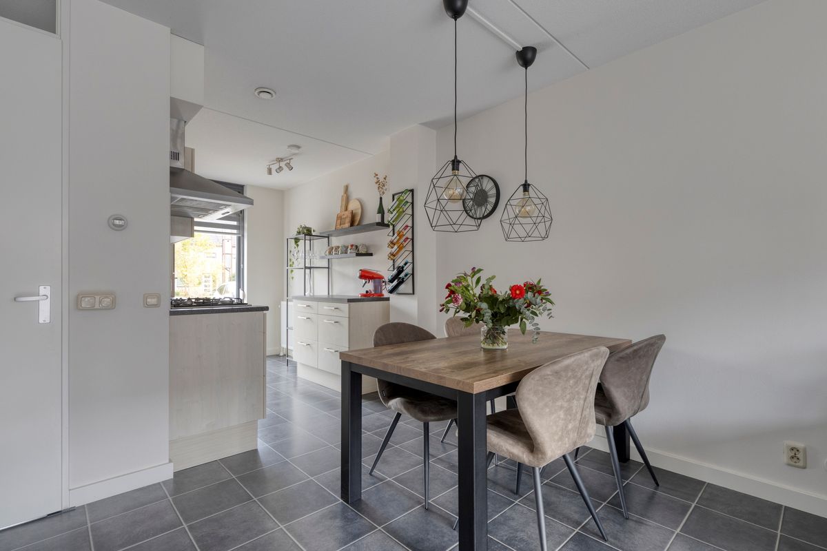 De woning wordt betreden via de hal, waar zich de meterkast, de trapopgang en de toiletruimte met staand toilet en fonteintje bevinden. Vanuit de hal komt men in de lichte, tuingerichte woonkamer (ca. 28m²) met fijne zit- en eethoek en een handige provisie-/opbergkast. De brede raampartij met glazen loopdeur naar de achtertuin zorgt ervoor dat er veel daglicht kan toetreden, hetgeen de woonkamer extra aangenaam maakt. De aansluitende half open keuken is op de voor-/straatzijde georiënteerd, waar zich eveneens een groot en tot op de grond doorlopende raampartij bevindt, waardoor ook hier veel daglicht toe kan treden. De keuken is naast de nodige kast- en laderuimte ingericht met een dubbel keukenblok inclusief diverse keukenapparatuur zoals een koelkast, vaatwasser, combimagnetron, gaskookplaat en afzuigkap. Zowel de hal, de keuken als de woonkamer zijn afgewerkt met een tegellook laminaatvloer, licht gespoten wanden en een licht gespoten plafond.