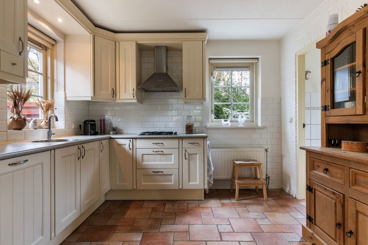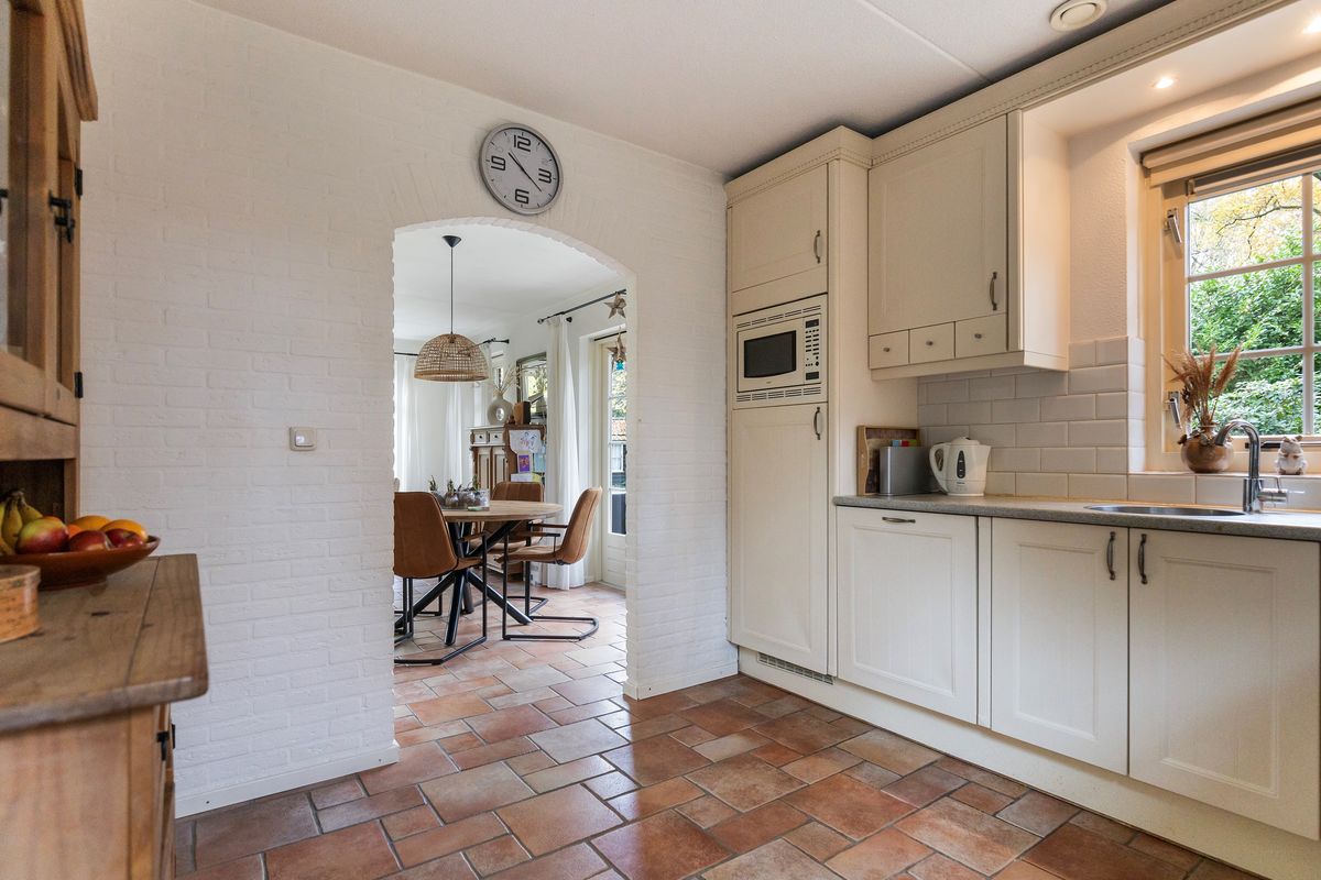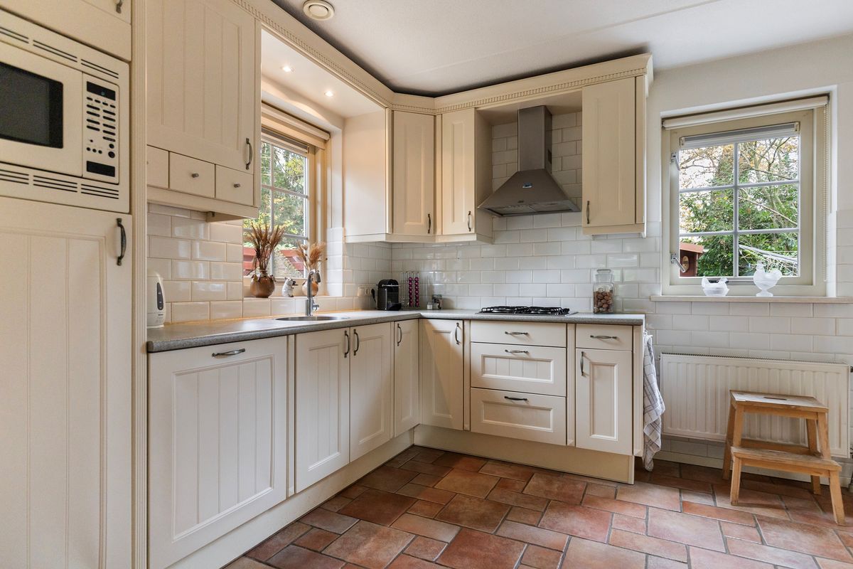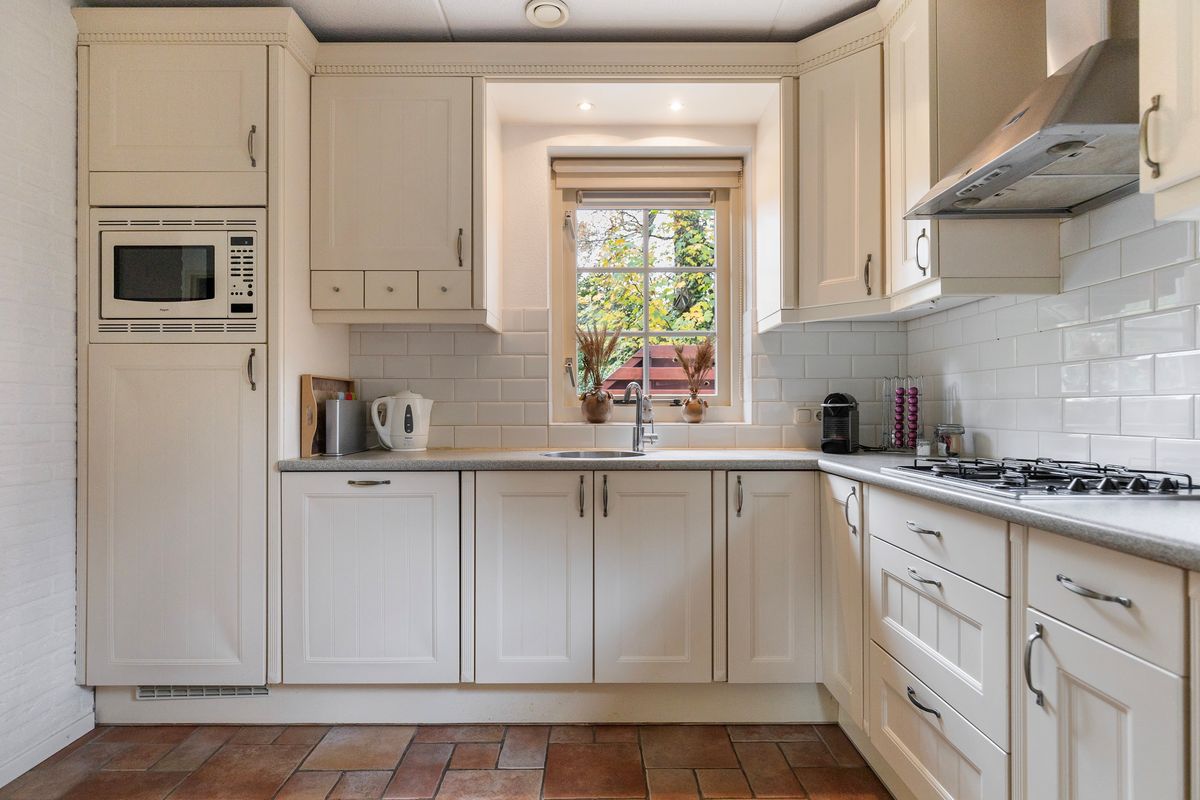 De keuken bevindt zich aan de achterzijde van de woning en is uitgevoerd in een praktische hoekopstelling. Deze is uitgerust met een koelkast, vaatwasser, combimagnetron, gaskookplaat met afzuigkap. Ook is er via de keuken toegang tot de bijkeuken met aansluitingen voor witgoed.