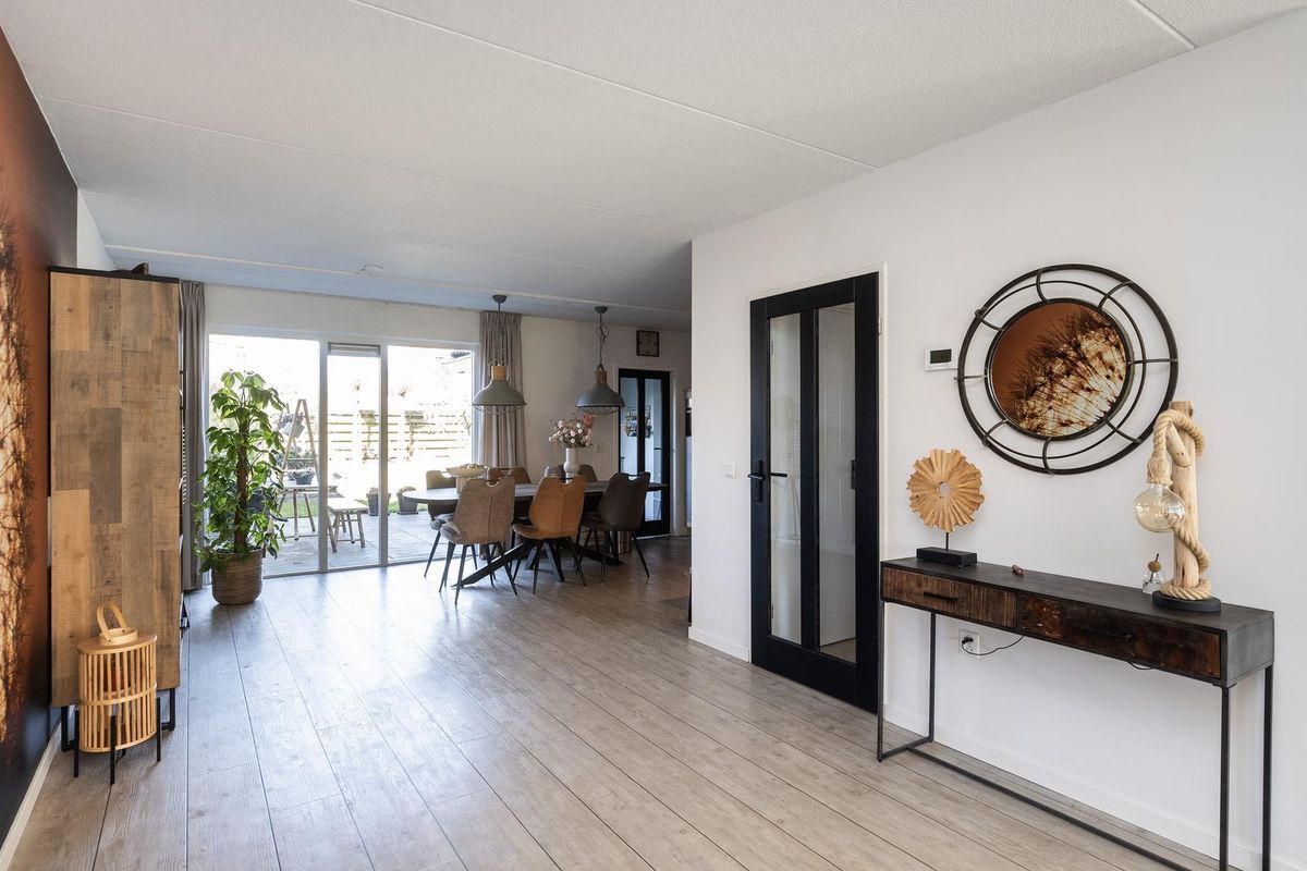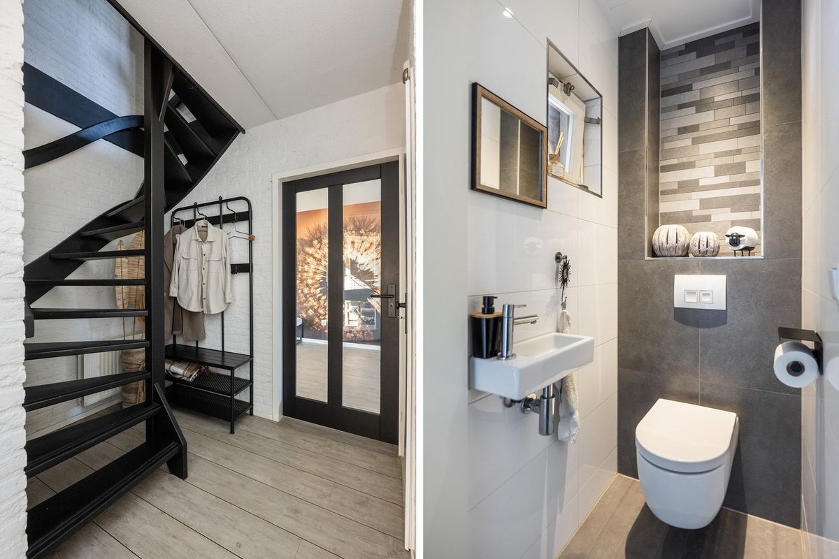 Via de overdekte entree betreedt u de woning. In de ruime hal vindt u het moderne toilet met fontein, de trapopgang, de meterkast en de toegang tot zowel de woonkamer als de garage.
