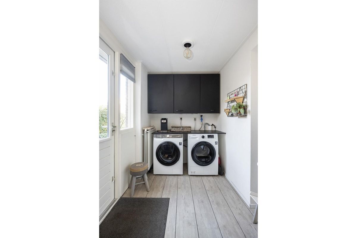 Aansluitend bevindt zich de praktische bijkeuken met aansluitingen voor wasmachine en droger en een directe toegang naar de tuin. Verder is er nog een heel praktische garage; ideaal voor de fietsen en tuinspullen.