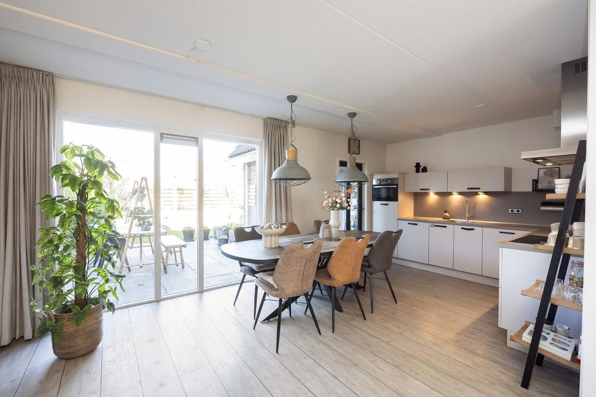 De open keuken is uitgevoerd in een lichte, tijdloze stijl en voorzien van alle benodigde inbouwapparatuur: een keramische kookplaat, afzuigkap, combimagnetron, koelkast en vaatwasser. Ook hier zorgt de grote raampartij voor een prachtige lichtinval en een fraai uitzicht op de verzorgde achtertuin.
