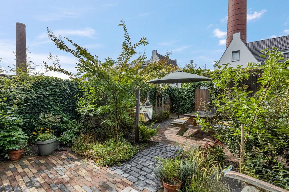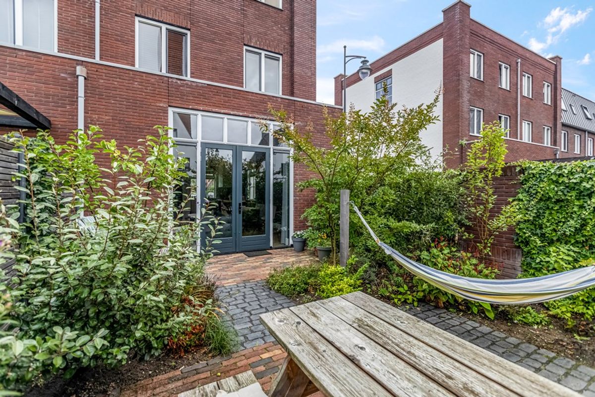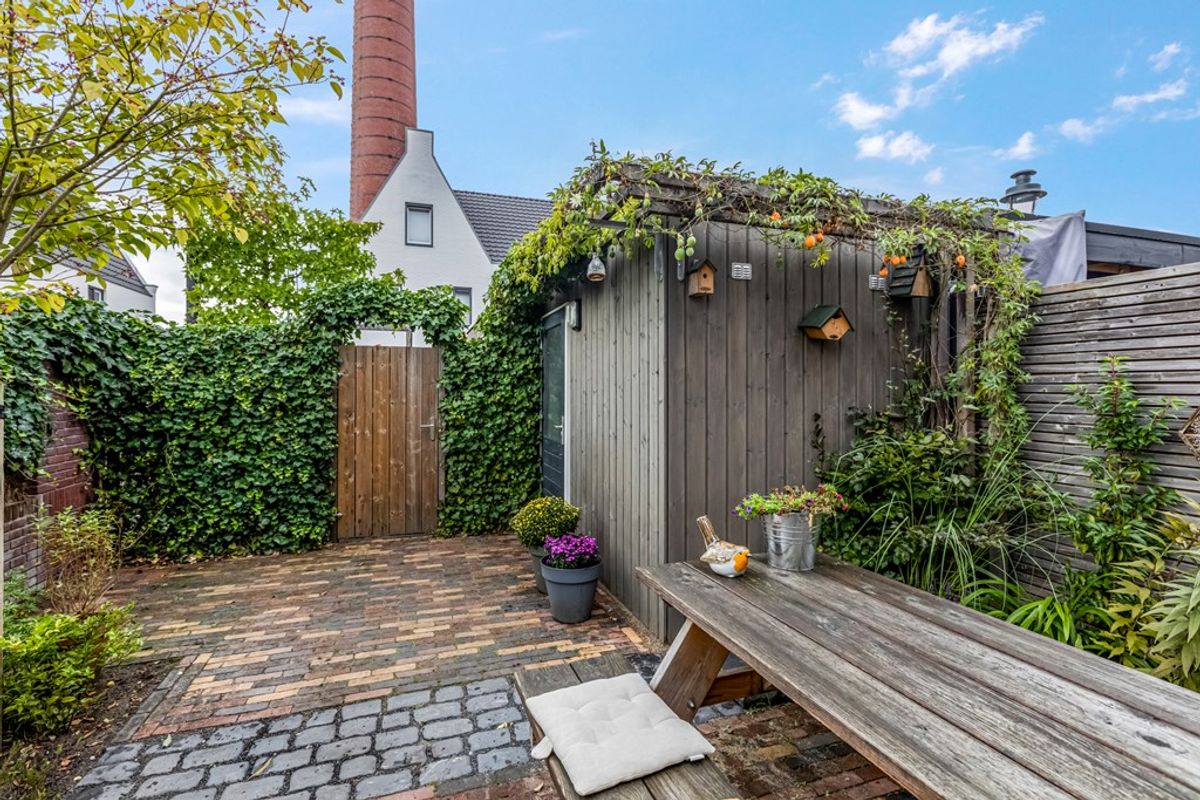 De groene achtertuin ligt op het zonnige westen, waardoor je al vanaf het einde van de ochtend van de zon kunt genieten. Er zijn momenteel diverse fruitbomen en er is ruimte voor een heerlijke hangmat, eettafel of loungeset. Ook is er nog een buitenkraan. De houten berging met elektra biedt ruimte voor fietsen en opslag.