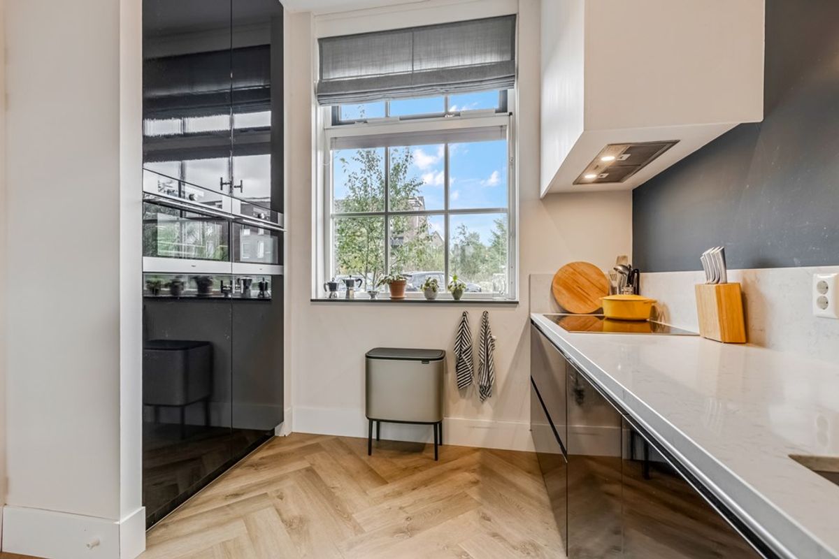 De hoekkeuken heeft een op maat gemaakte apparatenwand tot aan het plafond. De zwarte, greeploze fronten in strijklak, brede lades en aluminium details geven de keuken een luxe uitstraling. De keuken is uitgerust met twee koelkasten, vaatwasser, inductiekookplaat, afzuigkap met schouw, een oven en een combi-oven.