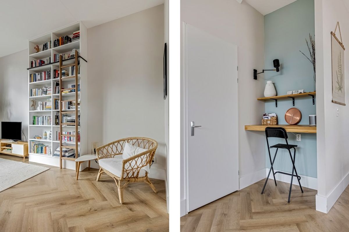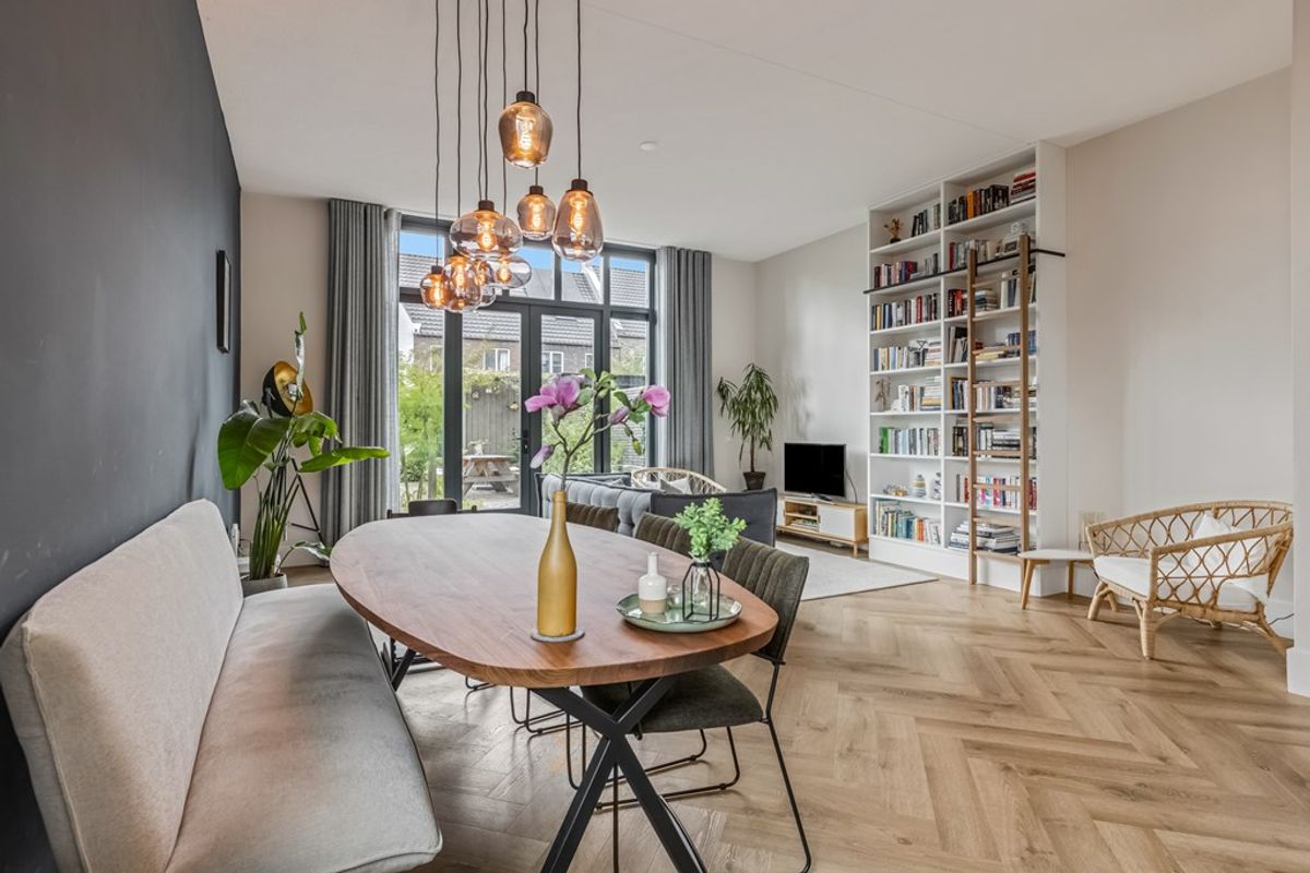 De standaard schuifpui heeft plaatsgemaakt voor een op maat gemaakte pui met openslaande deuren naar de tuin. Van hieruit is mooi de grote schoorsteen in zijn geheel te zien. De hoge ramen van vloer tot plafond brengen veel licht binnen en benadrukken de hoogte van de ruimte. De woonkamer biedt genoeg plek voor een ruime zit- een eethoek en beschikt over een praktische trapkast en een extra werkplek.