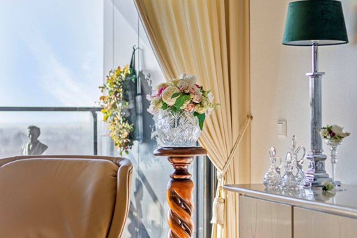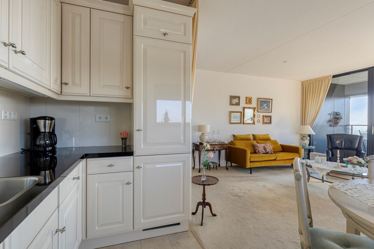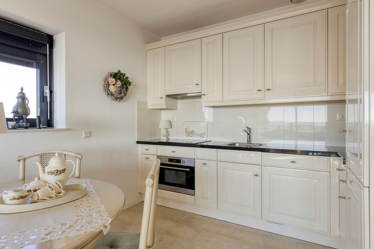 De woonkamer is ruim opgezet en profiteert van grote raampartijen die zorgen voor veel daglicht en een open gevoel. Vanuit deze ruimte heeft u direct toegang tot het balkon. De open keuken sluit aan op het woongedeelte en is uitgevoerd in een lichte opstelling met boven- en onderkasten, een contrasterend werkblad en diverse inbouwapparatuur (inductiekookplaat, vlakscherm afzuigkap, oven, koel-/vrieskast en vaatwasser. De keuken vormt een praktische en overzichtelijke plek voor het bereiden van maaltijden.