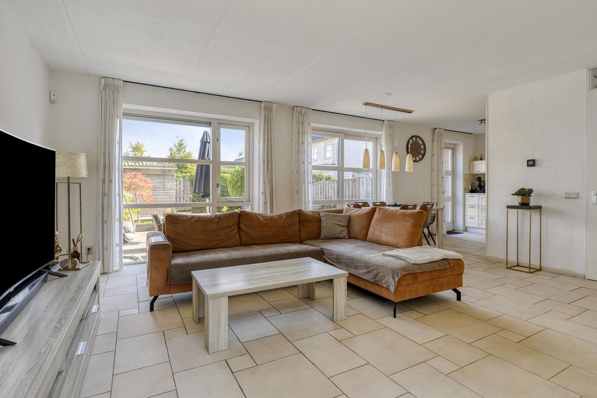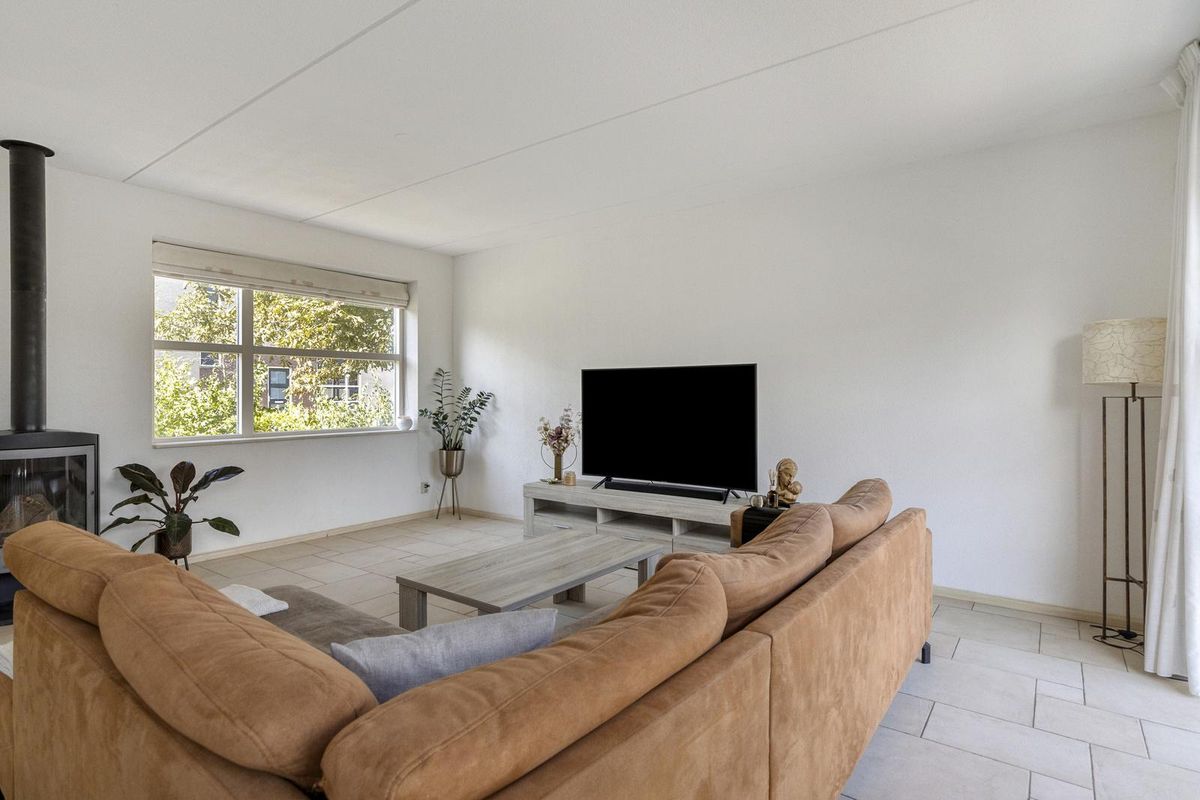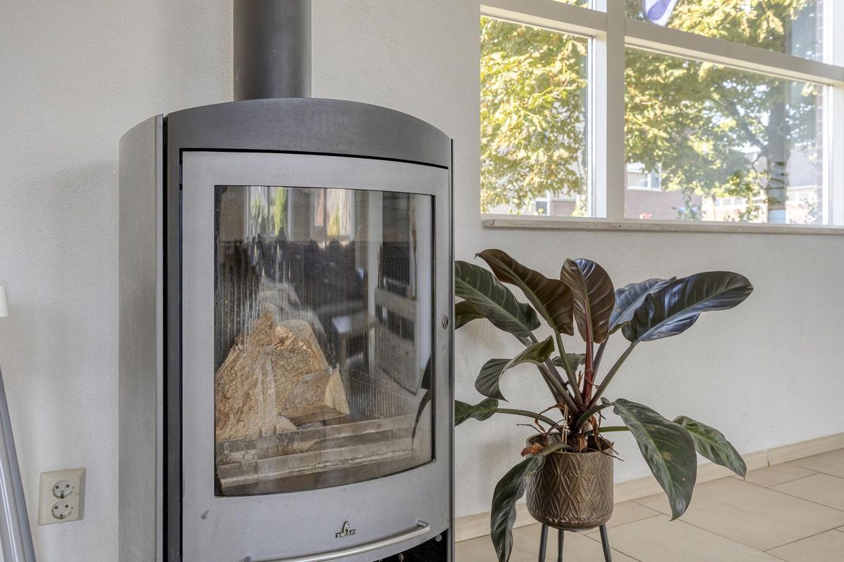 De brede woonkamer is voorzien van een sfeervolle houtkachel, plavuizen met vloerverwarming, en een schuifpui naar de tuin. Dankzij de grote raampartijen is er volop lichtinval.