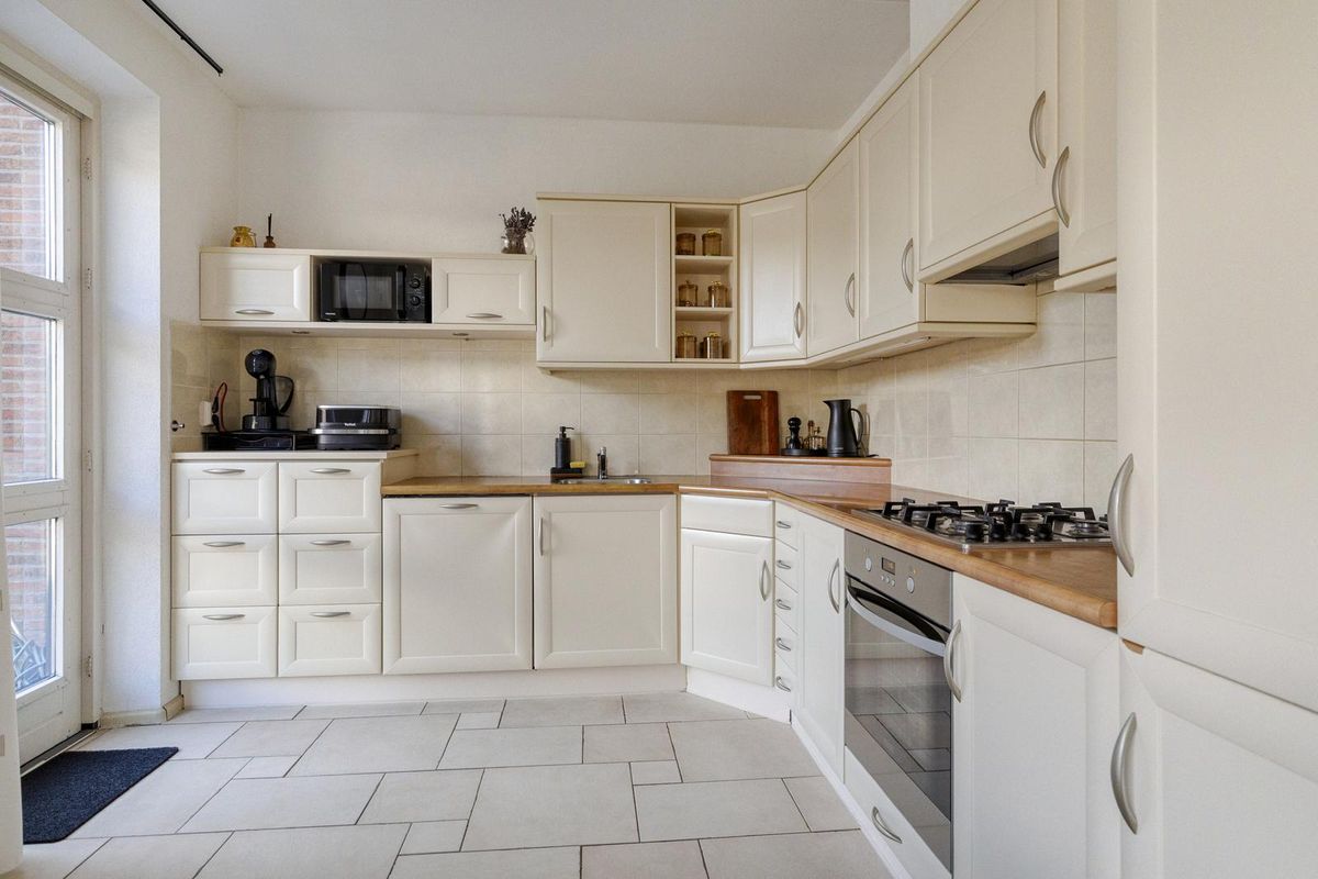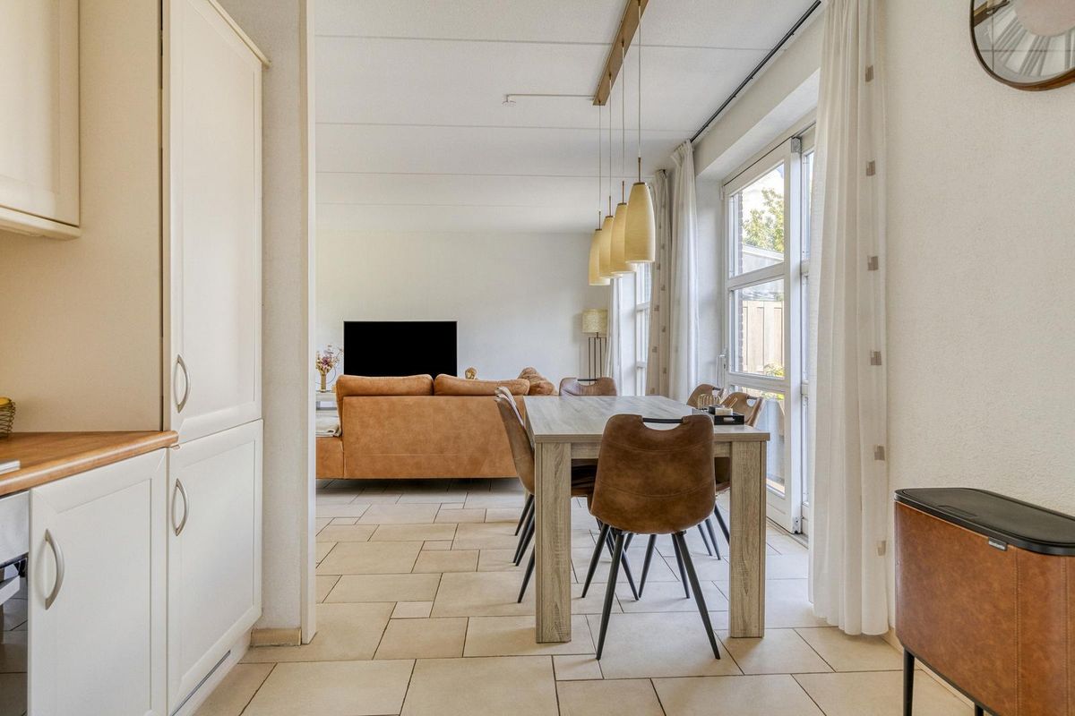 Aan de achterzijde bevindt zich de complete keuken in L-opstelling, uitgerust met diverse inbouwapparatuur, waaronder een koelkast, vriezer, oven, vaatwasser, 4-pits gaskookplaat, afzuigschouw en spoelunit. Vanuit de keuken is er directe toegang tot de tuin.