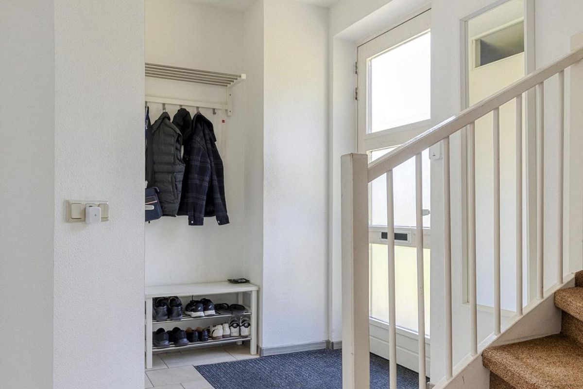 Entrance with meter cupboard (fiber optic), fully tiled toilet with washbasin, cloakroom, and staircase.