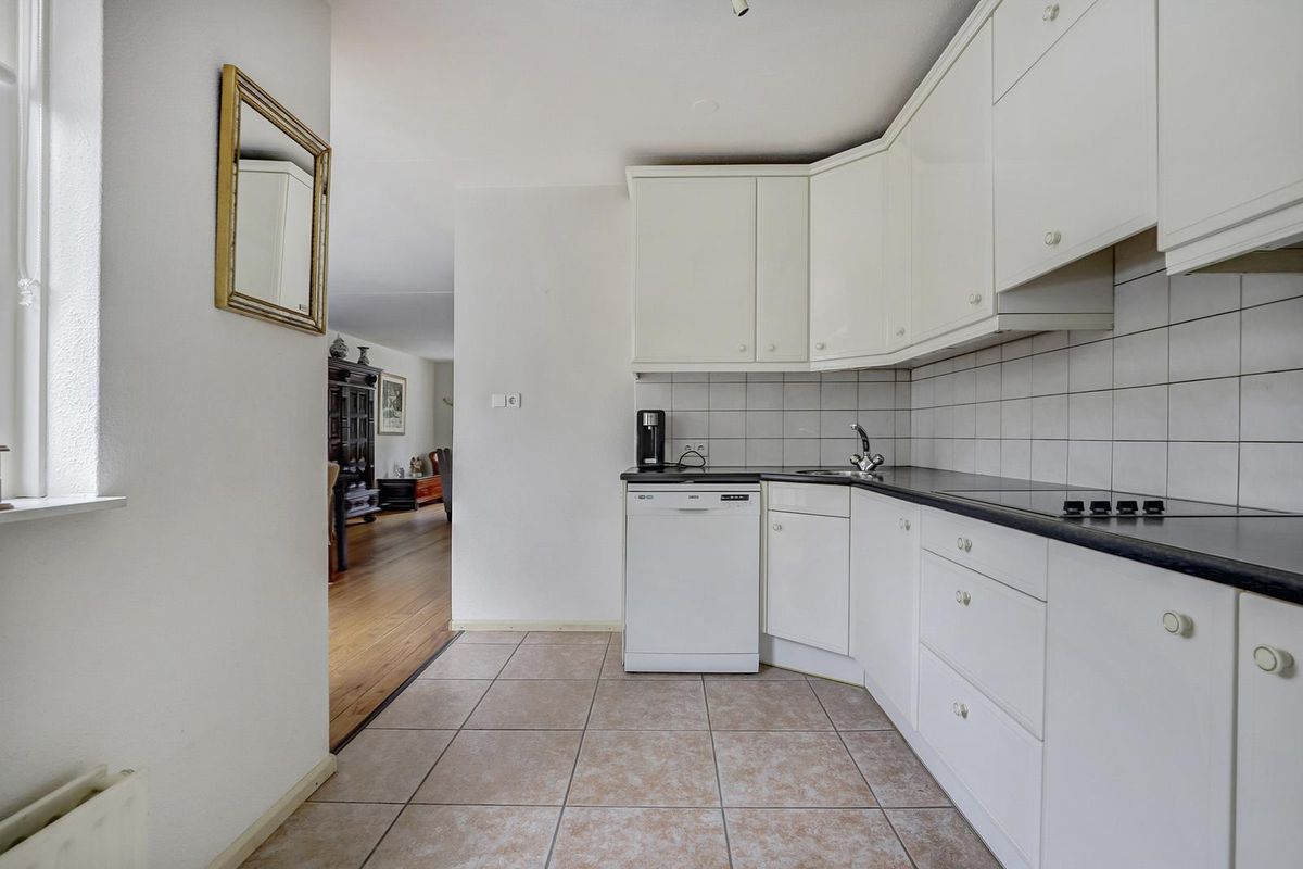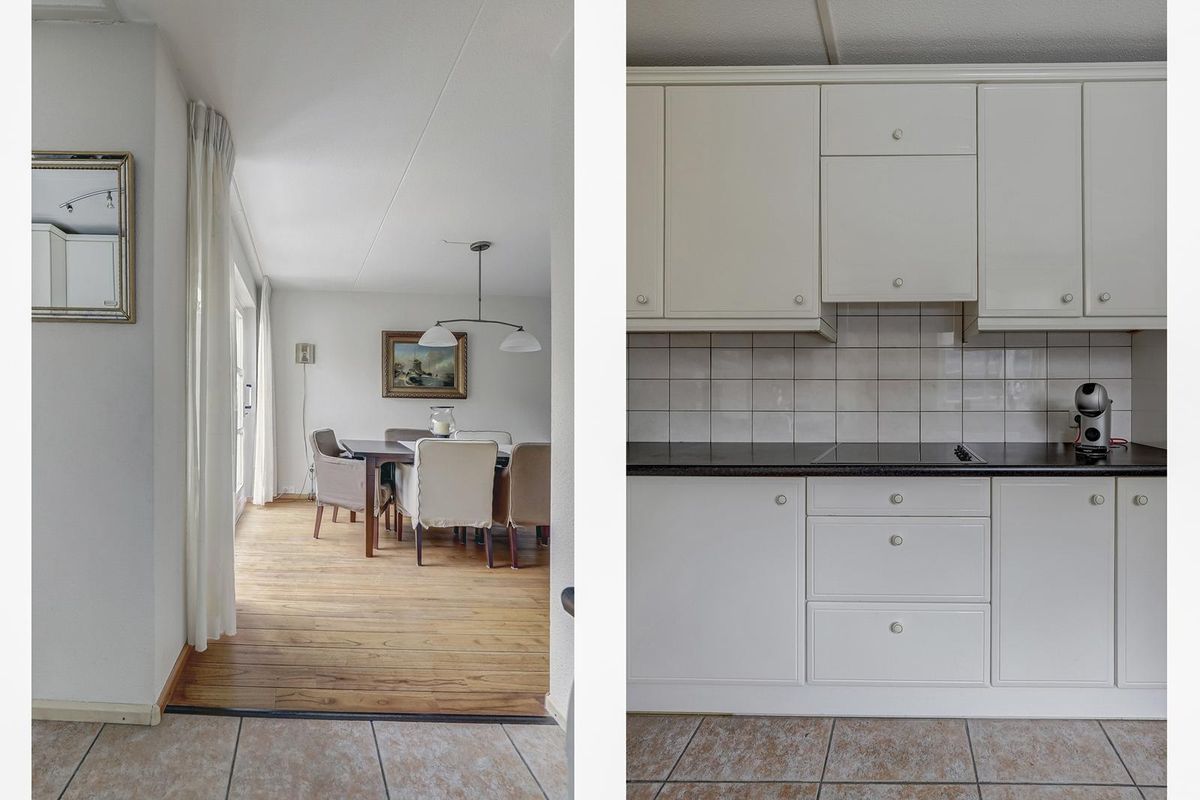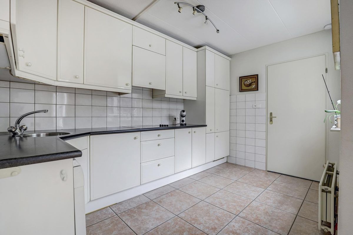 De keuken is bereikbaar vanuit de woonkamer en biedt veel kastruimte, een donker werkblad en een 4-pits kookplaat met afzuigkap. Ook is er een losse vaatwasser aanwezig. Aansluitend ligt de bijkeuken met wasmachine- en drogeraansluiting en de cv-opstelling. Vanuit hier is de garage toegankelijk: een fijne plek voor auto, fietsen of extra opslag.